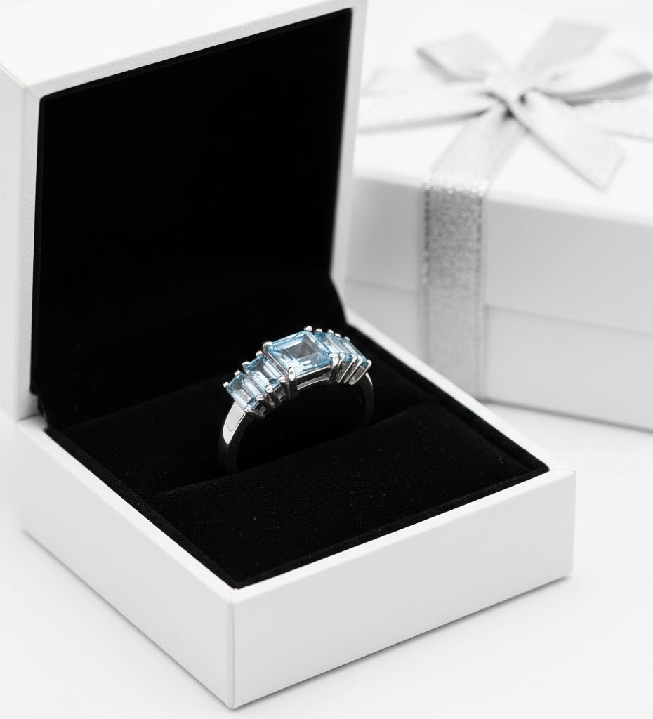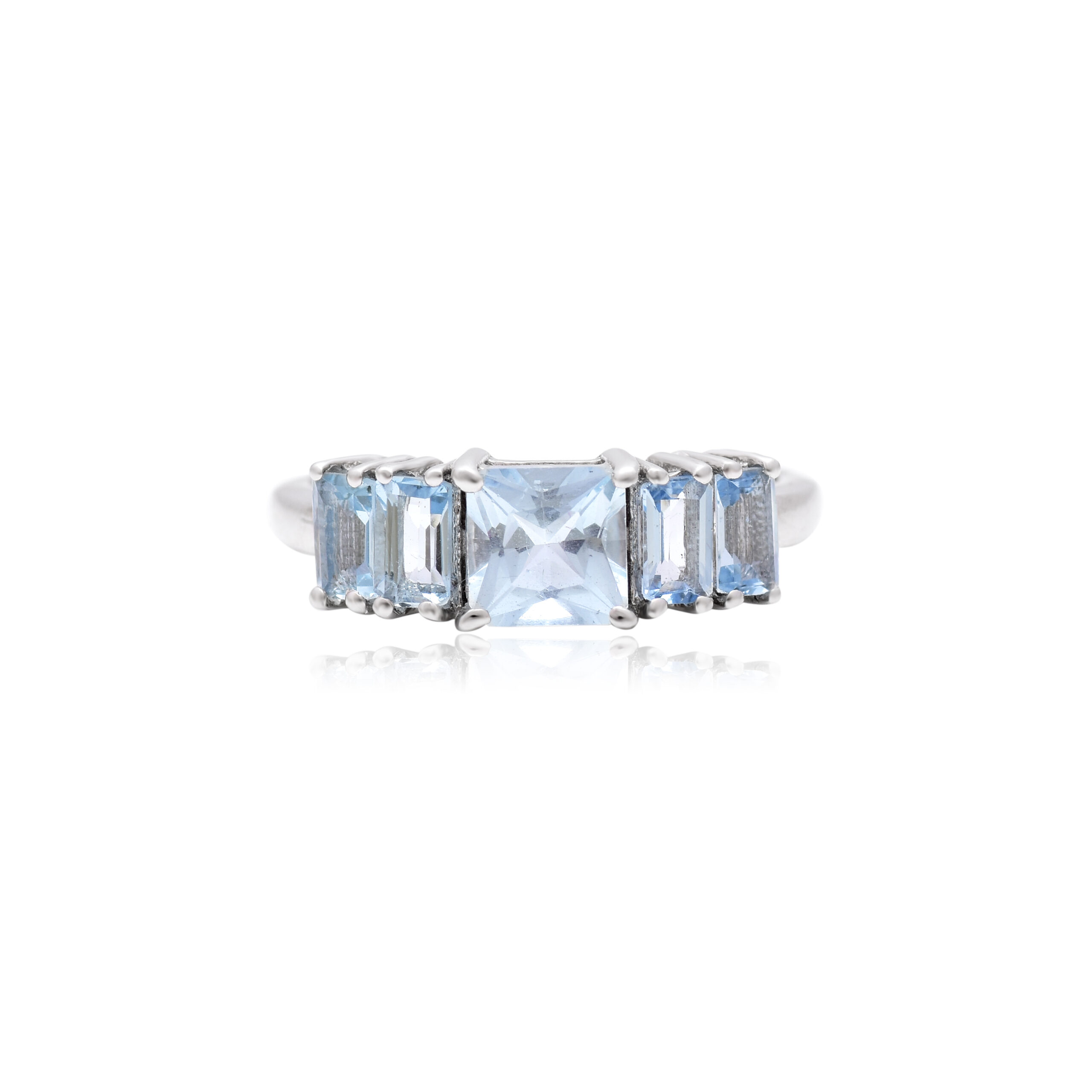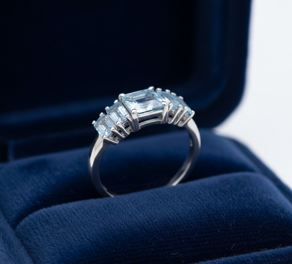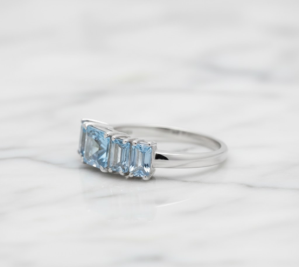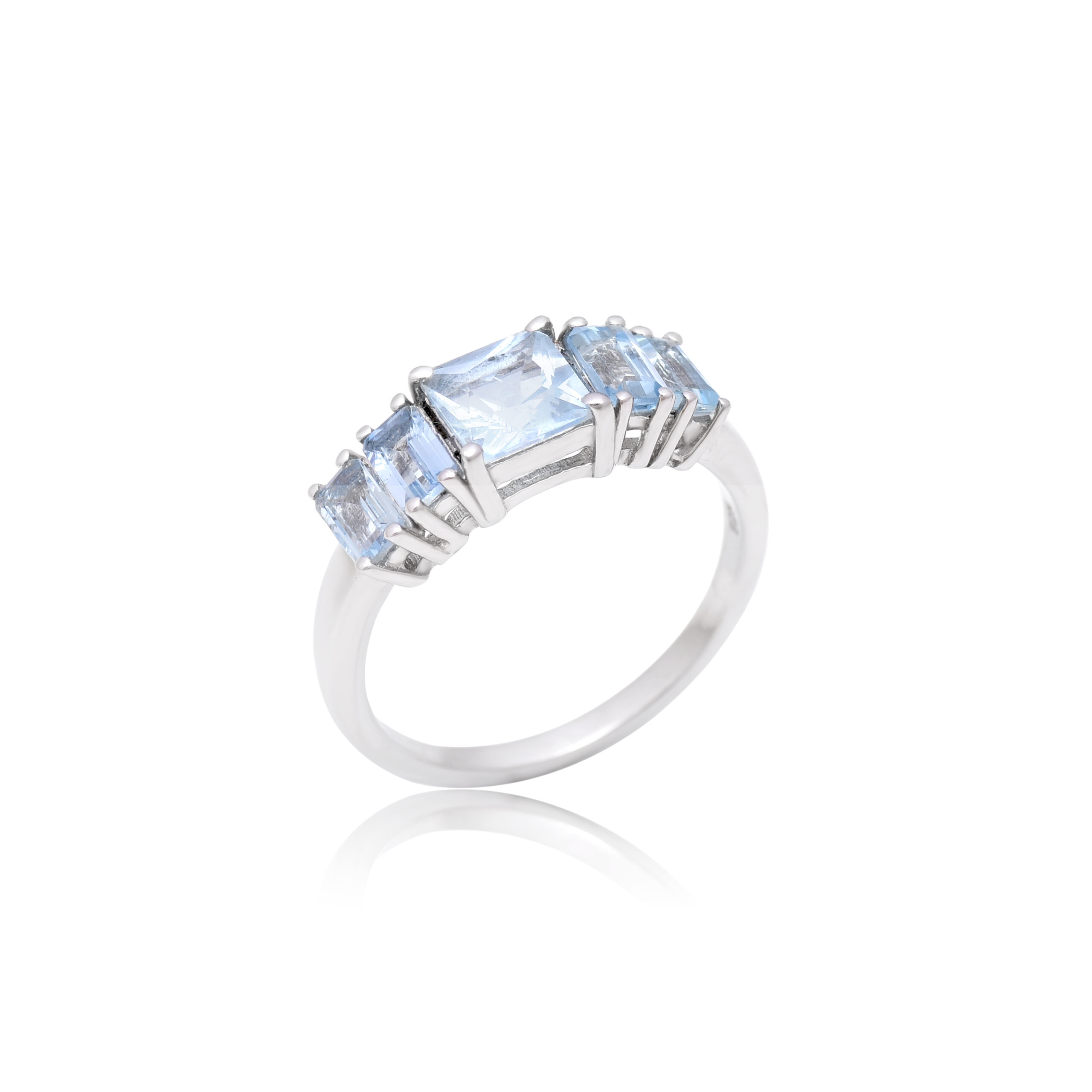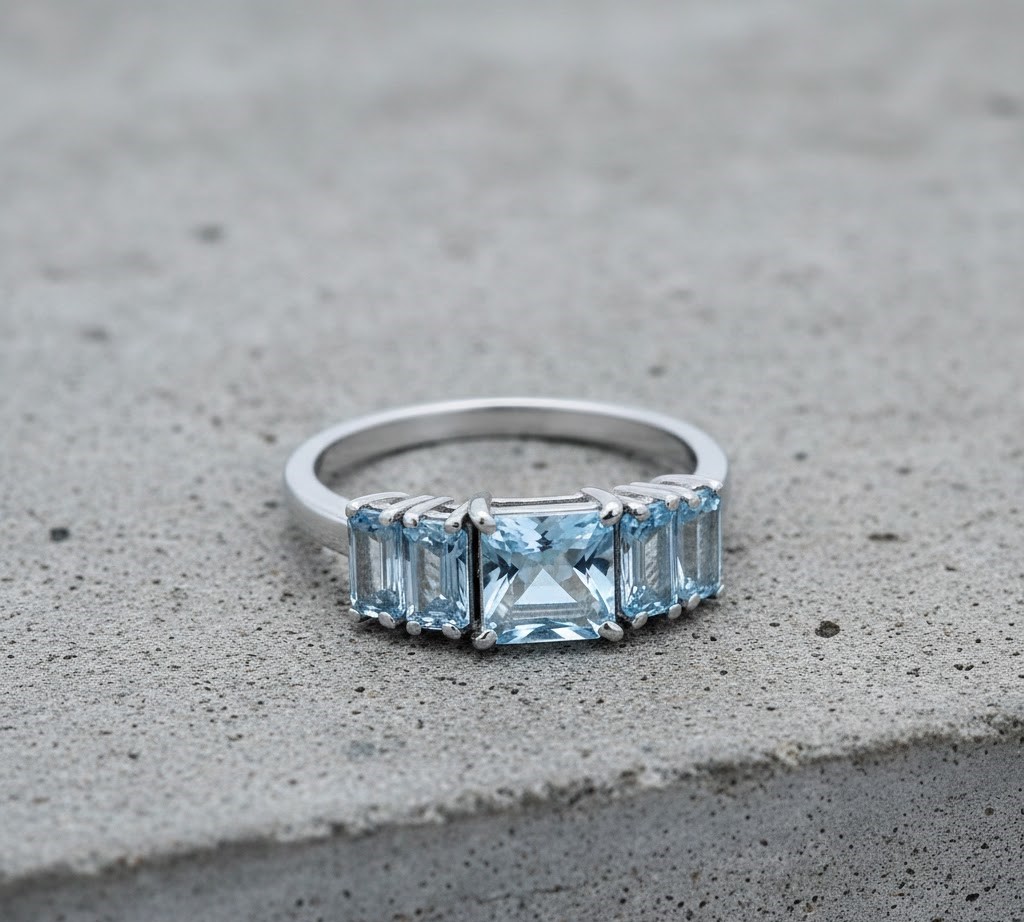 Handcrafted in solid 925 Sterling Silver, this ring features a stunning centerpiece of three graduated, rectangular-cut natural aquamarines.