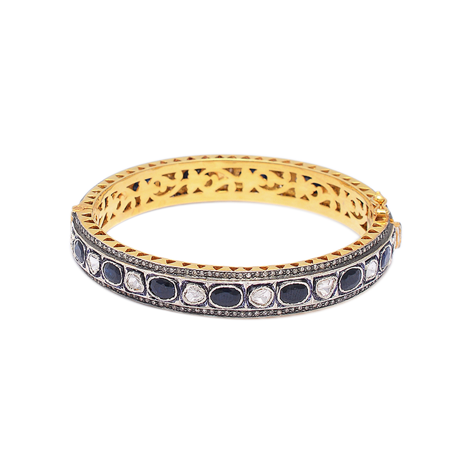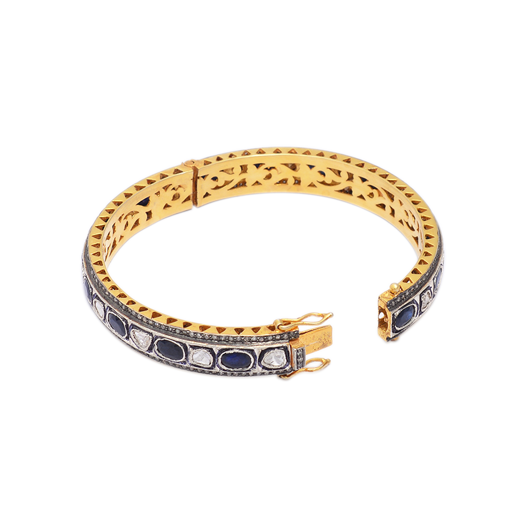 Elevate your jewellery collection with this stunning piece crafted in gold-plated silver, featuring rich blue sapphires, sparkling diamond polkis, and rustic uncut diamonds. The combination of deep blue stones and raw diamonds creates a regal, vintage-inspired look that exudes timeless elegance. Ideal for weddings, special occasions, or adding a luxurious touch to your festive outfits, this exquisite design is perfect for those who appreciate fine detailing and heritage-style statement jewellery.