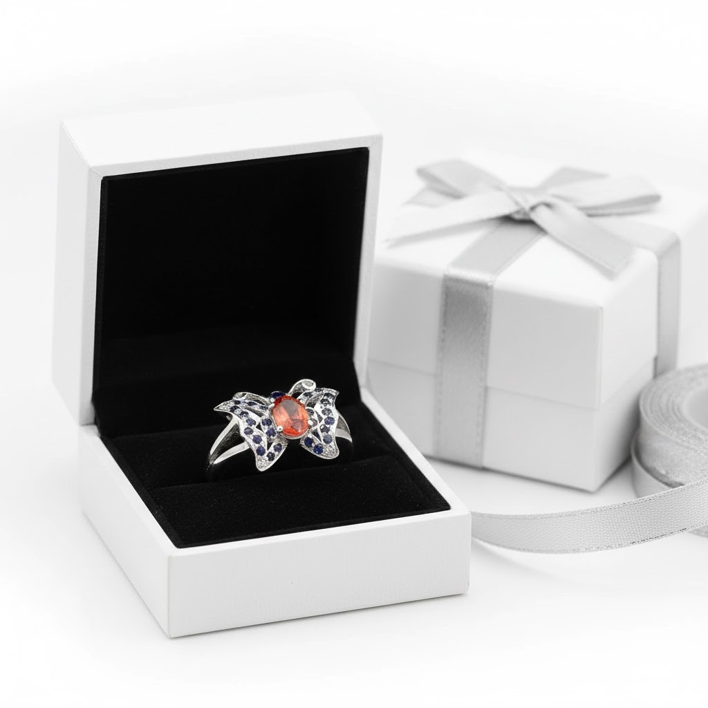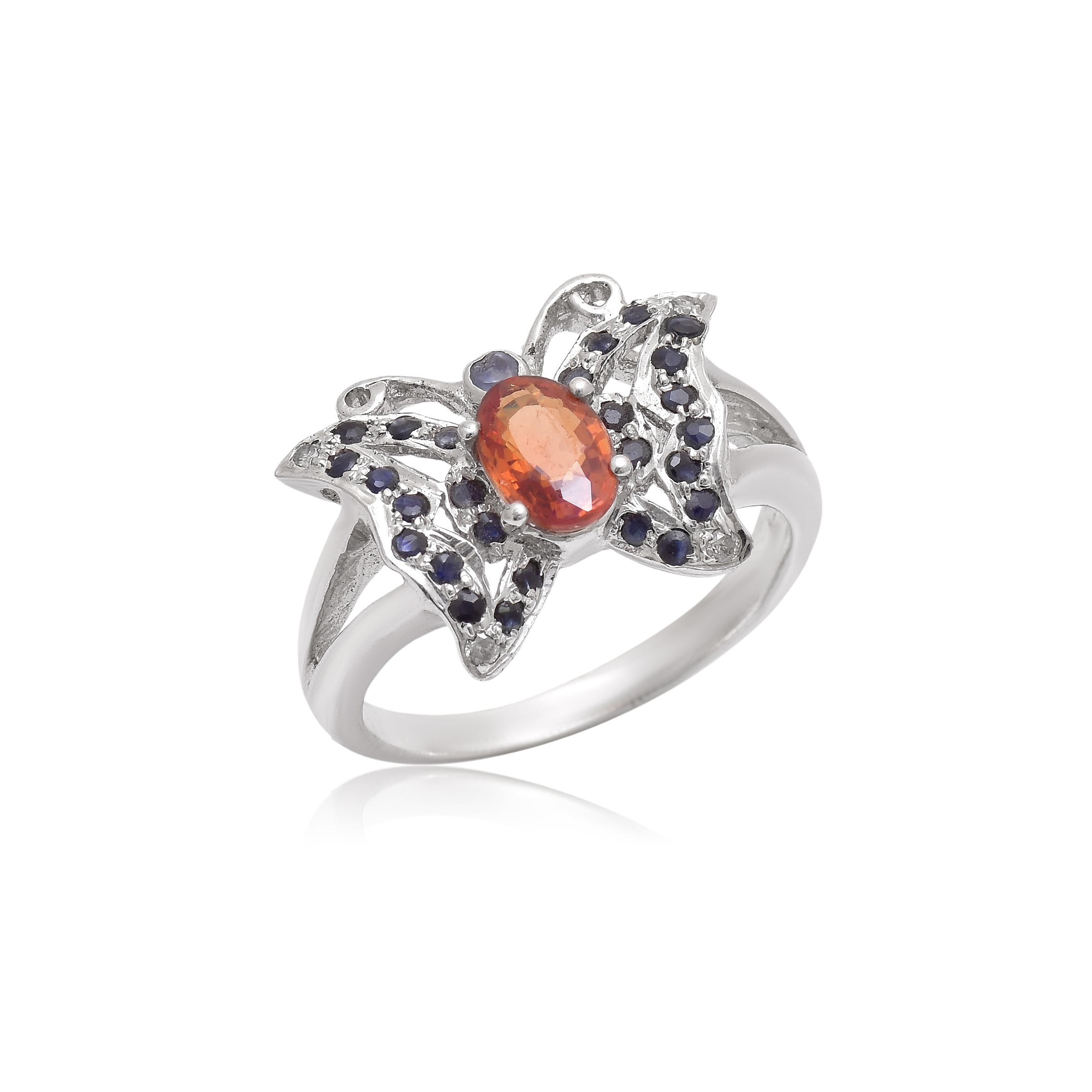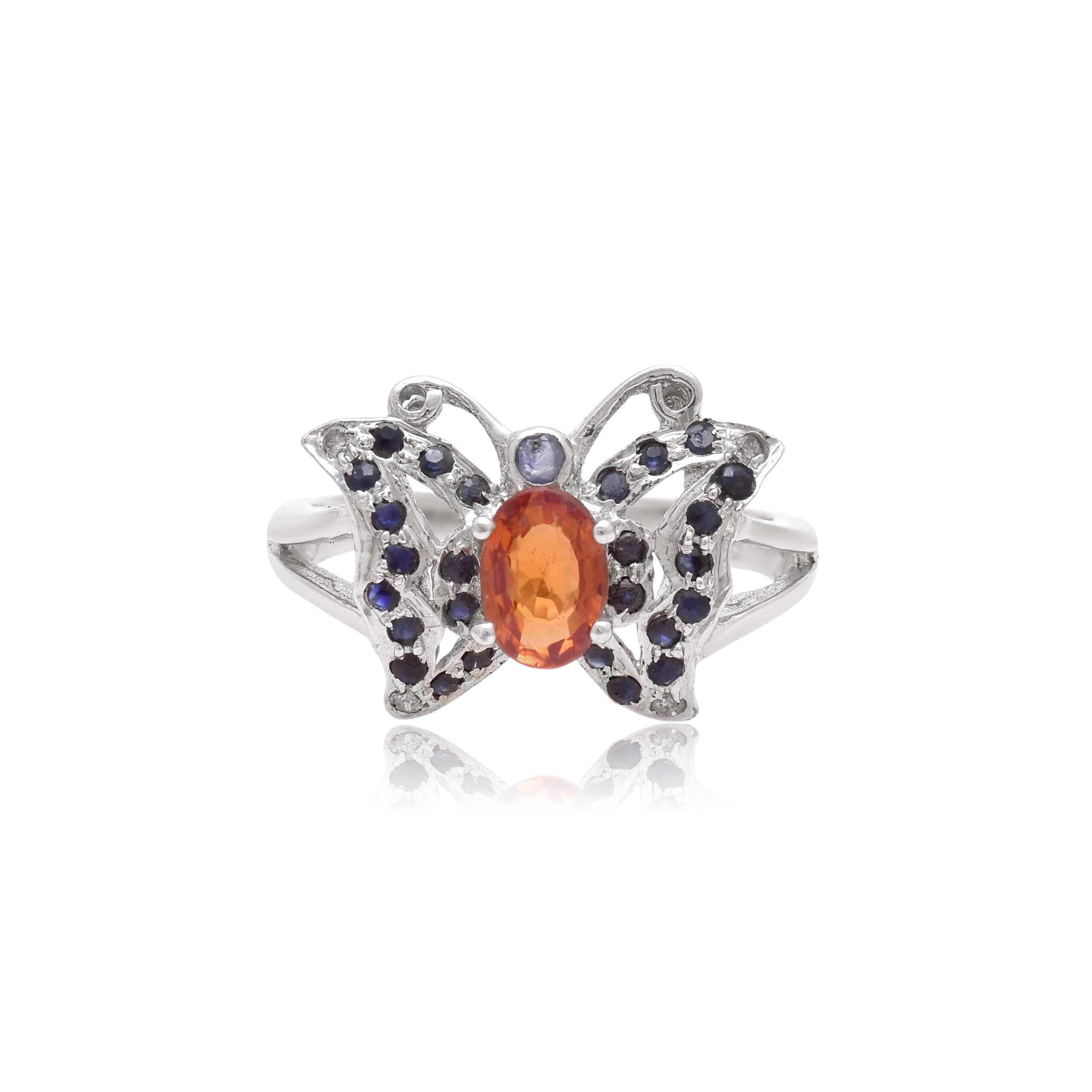 This 925 sterling silver ring features a delicate butterfly design, intricately set with vibrant blue and orange sapphires that mimic the beauty of nature. The contrasting gemstones provide a bold pop of color, making it a unique and charming statement piece for any jewelry lover.