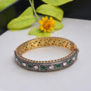 Experience timeless elegance with this Victorian-inspired bangle, featuring rich emeralds, sparkling diamond polkis, and raw uncut diamonds set in gold-plated sterling silver. The intricate craftsmanship highlights the vibrant green hues and natural brilliance of the stones, creating a stunning statement piece. Perfect for special occasions or elevating everyday style, this bangle beautifully combines vintage charm with refined sophistication.