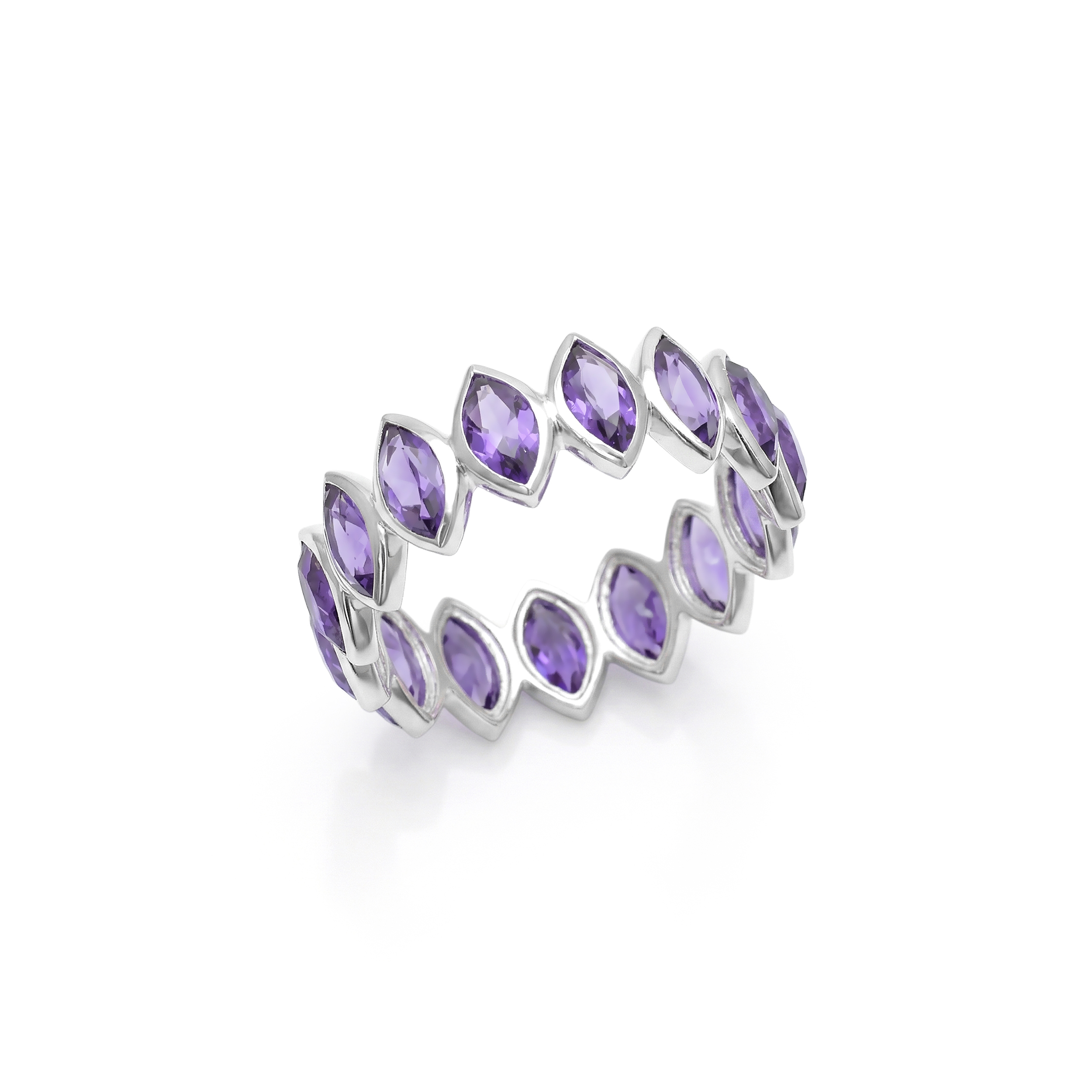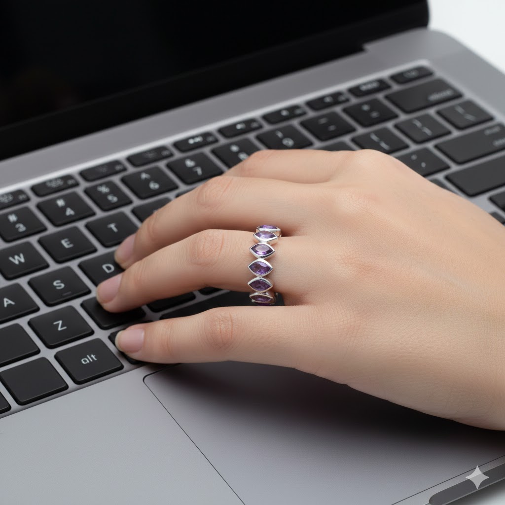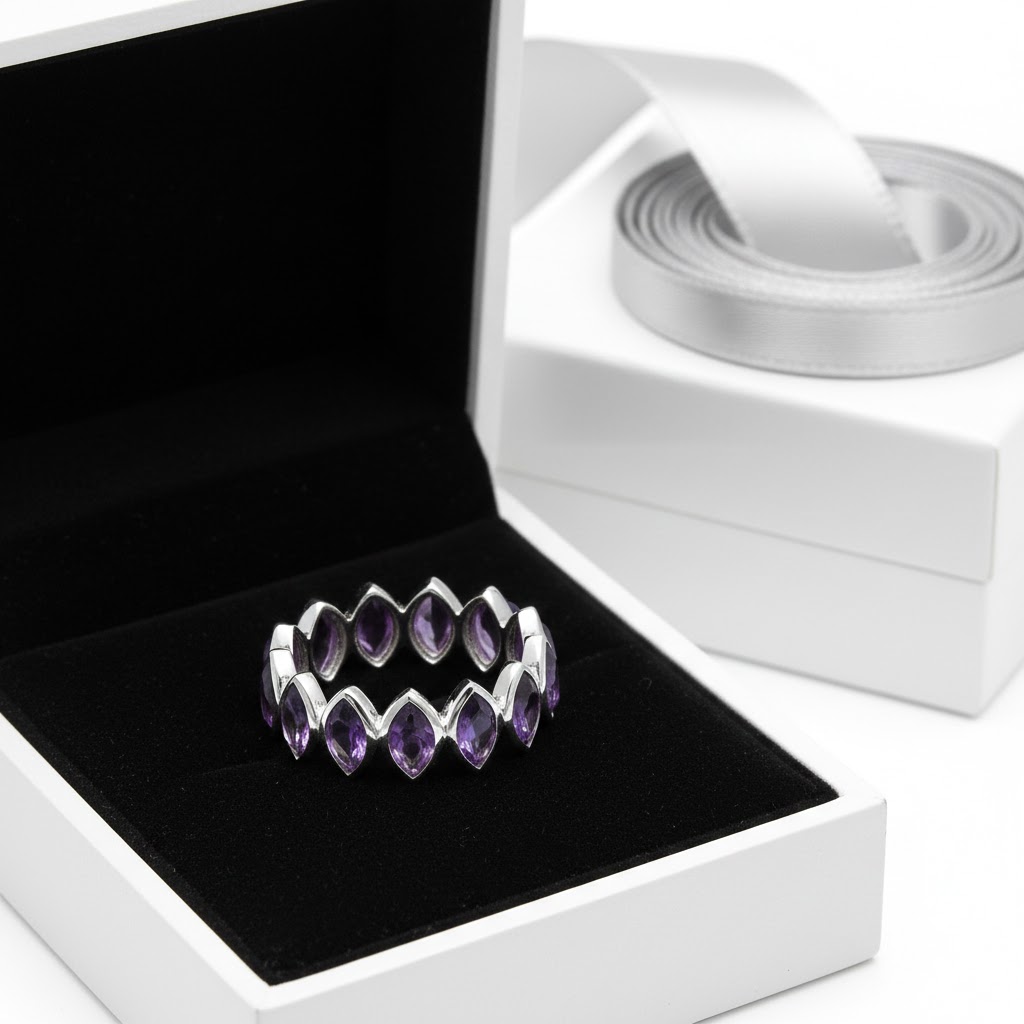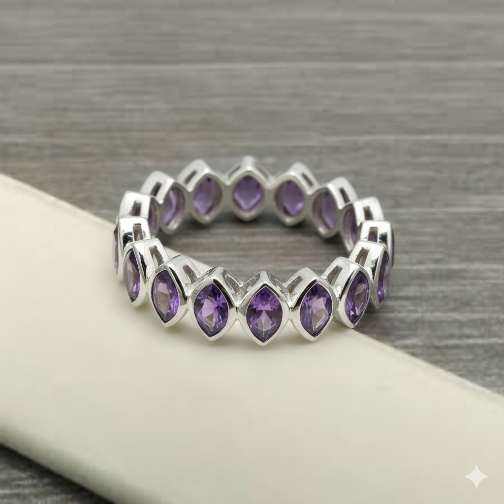 A crown of violet light, each marquise-cut amethyst catching whispers of elegance. Bold yet graceful, this ring blooms with timeless serenity and charm.