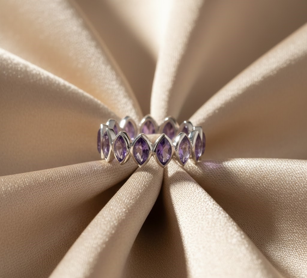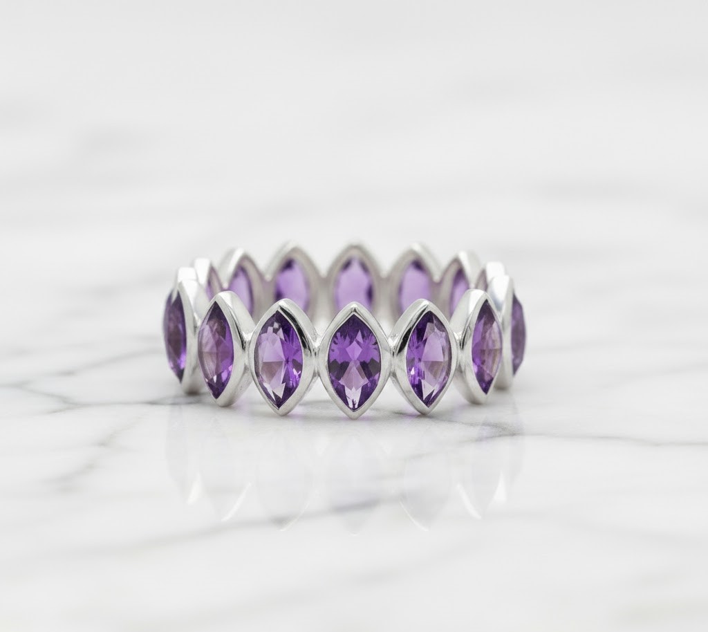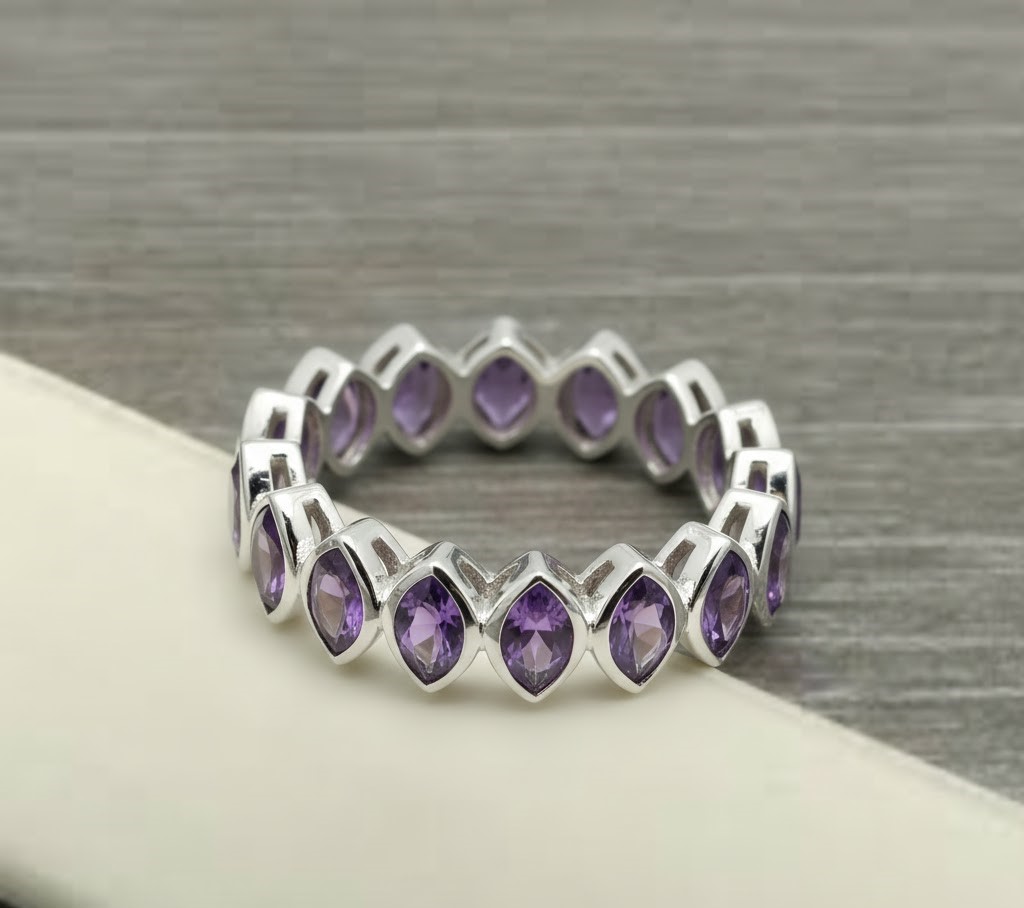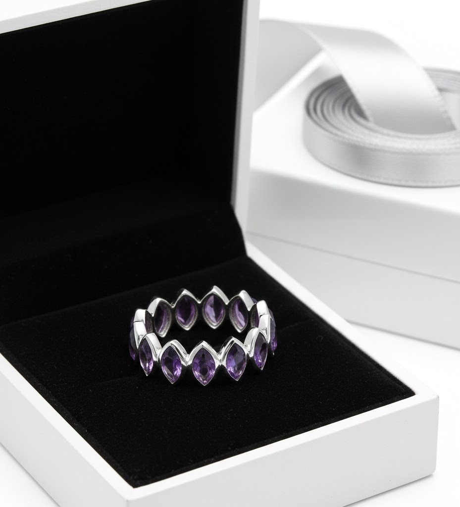 Handcrafted in premium 925 sterling silver, this elegant eternity-style band features a seamless row of natural, marquise-cut amethysts. The deep violet gemstones are encased in a modern bezel setting, creating a smooth, “leaf-like” silhouette that is as comfortable as it is striking.