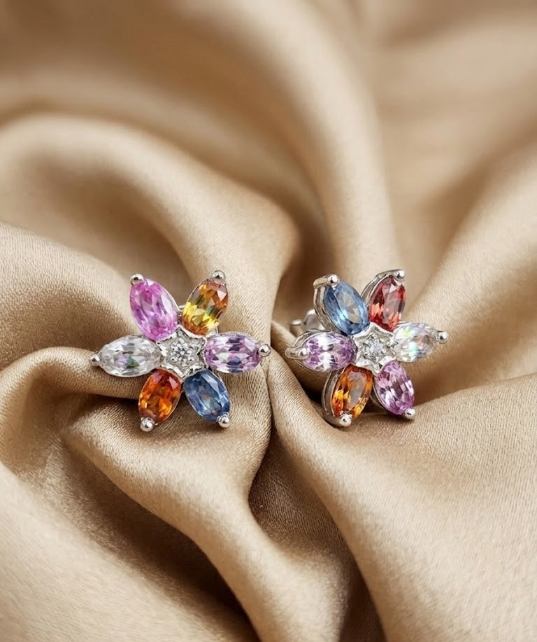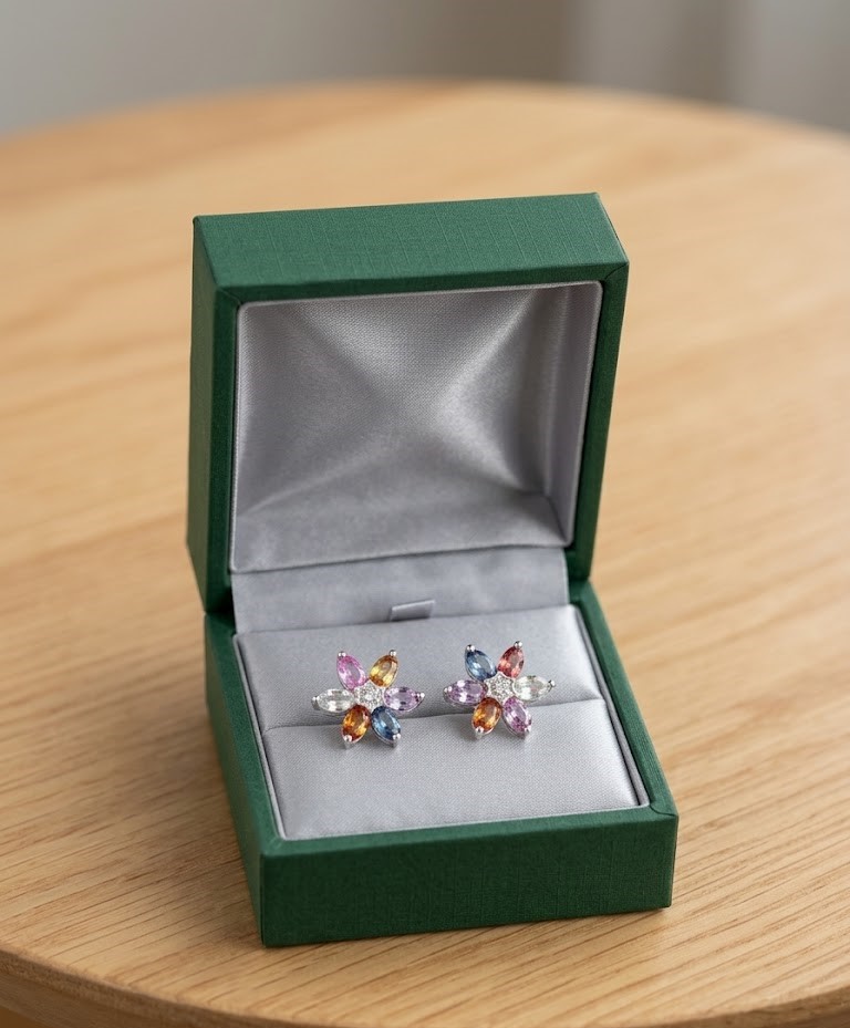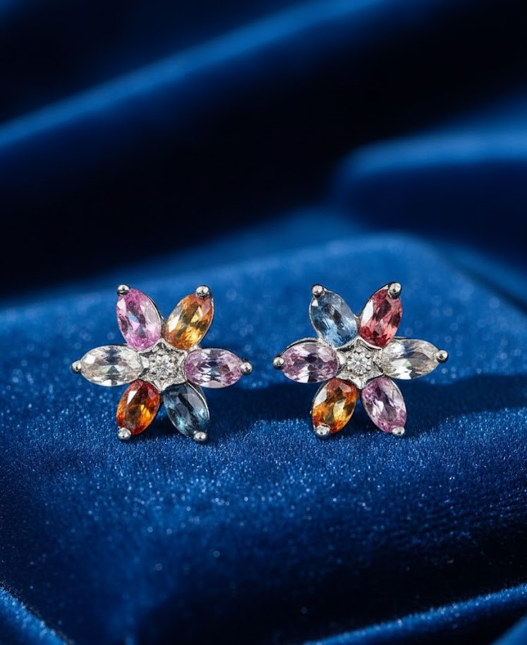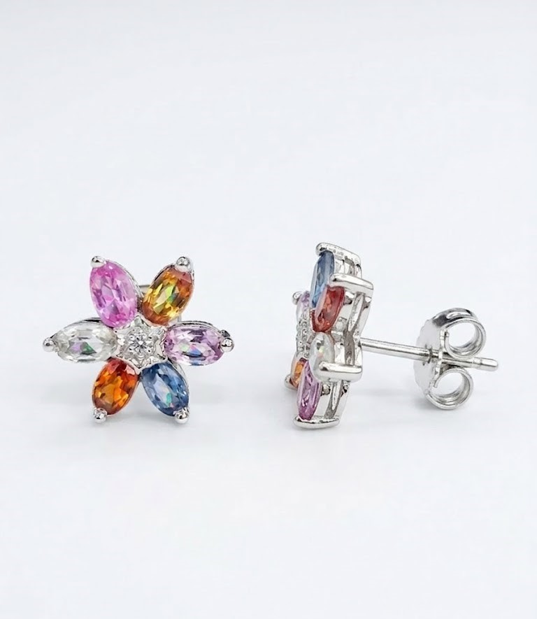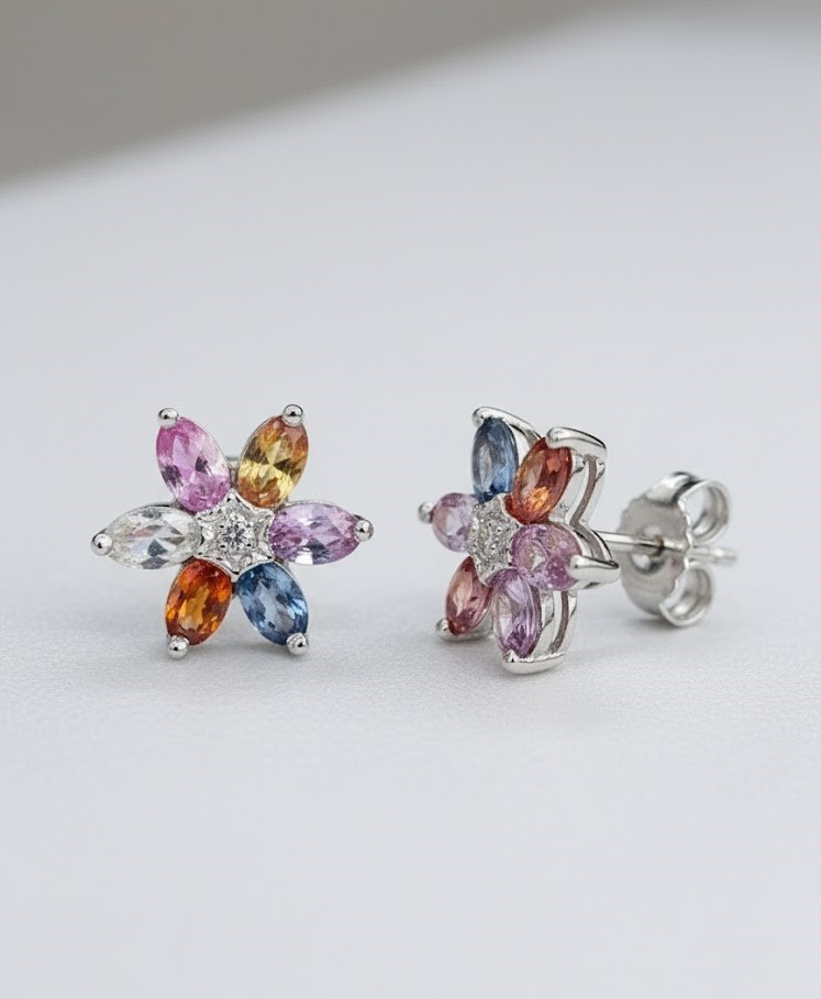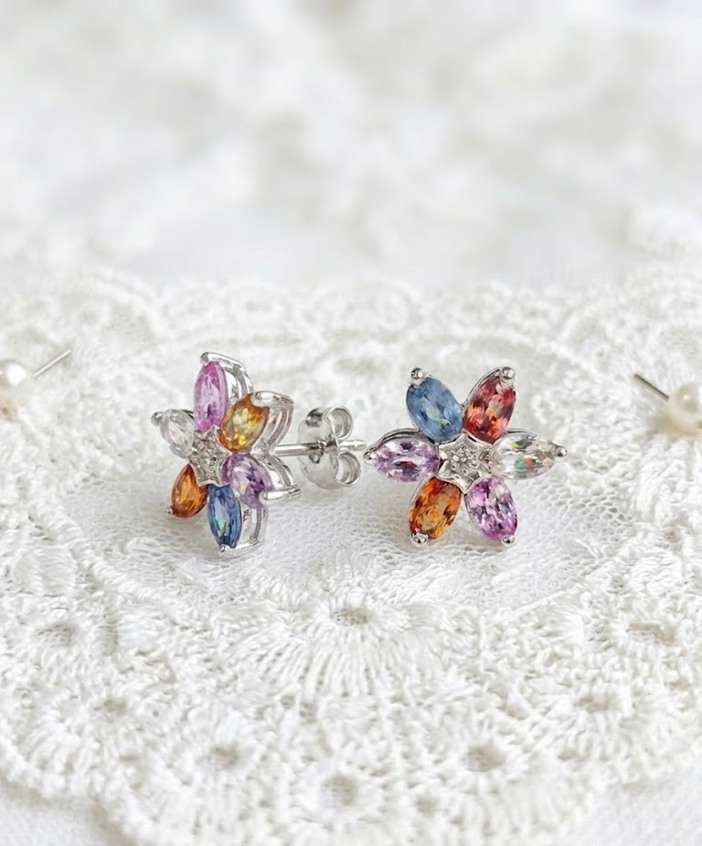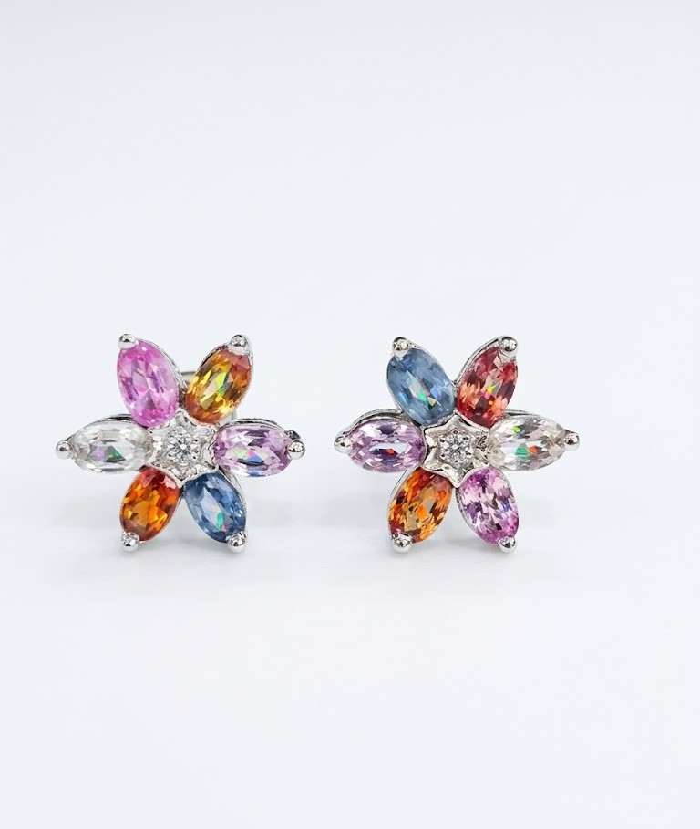 Crafted in high-quality 925 sterling silver, these flower stud earrings are a true celebration of color and light. Each earring features six genuine, oval-cut sapphires and at the heart of each floral setting sits a brilliant-cut genuine diamond.
