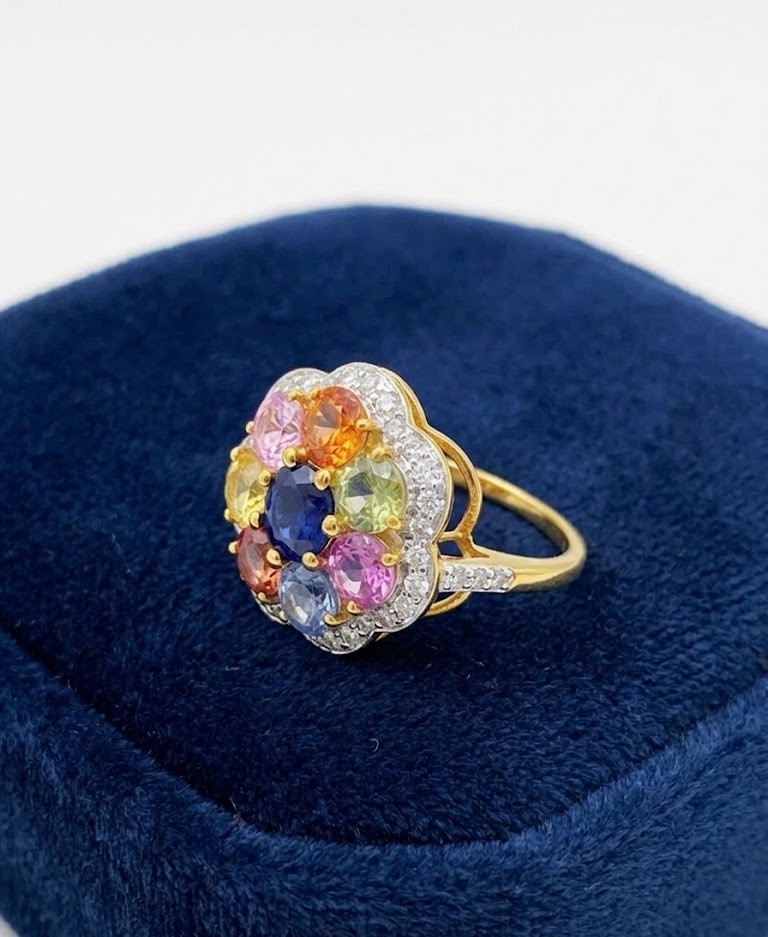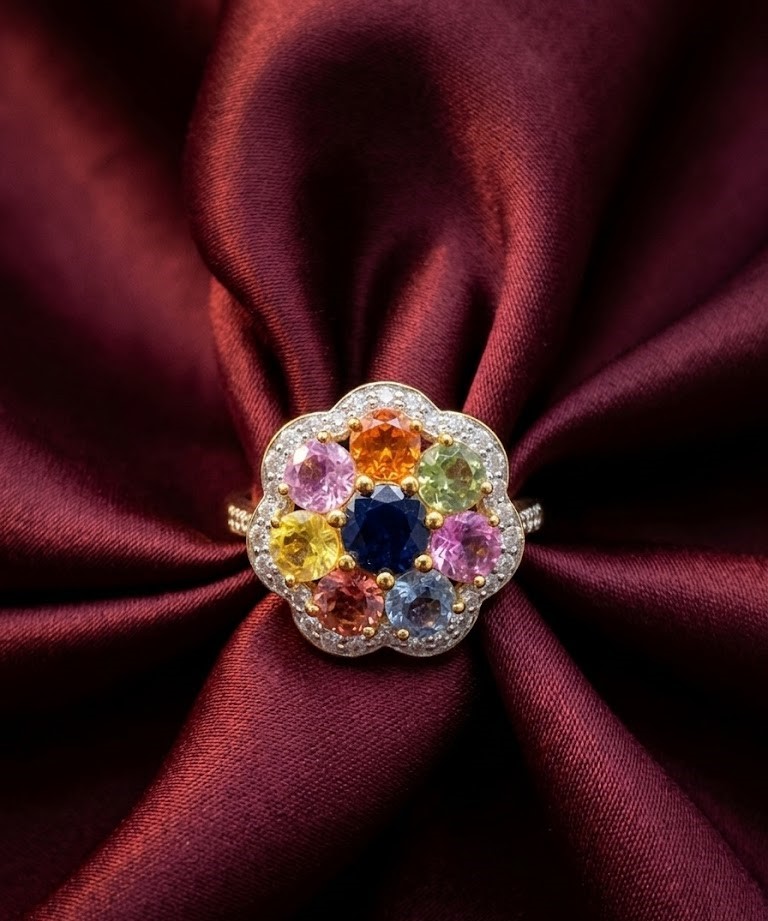 Designed to capture the light from every angle, this vibrant ring features a stunning “flower” arrangement of genuine round-cut sapphires in a spectrum of sunset hues—from deep blue and forest green to bright yellow and soft pink. A delicate halo of brilliant diamonds surrounds the cluster, adding a layer of classic luxury to this modern, colorful design.