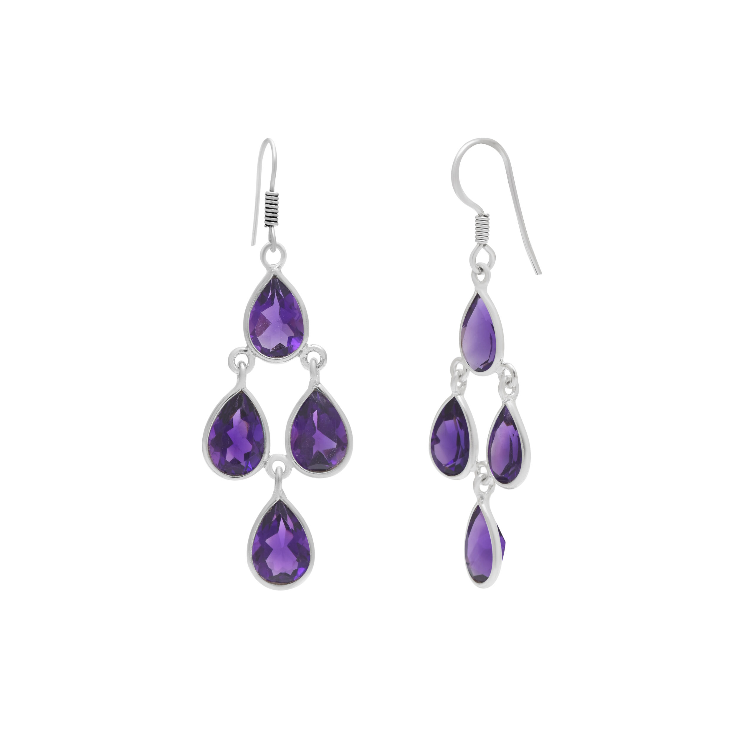 Designed for someone who loves a touch of royal flair, these earrings feature multiple pear-cut (teardrop) genuine amethysts suspended in a graceful, tiered 925 sterling silver setting.