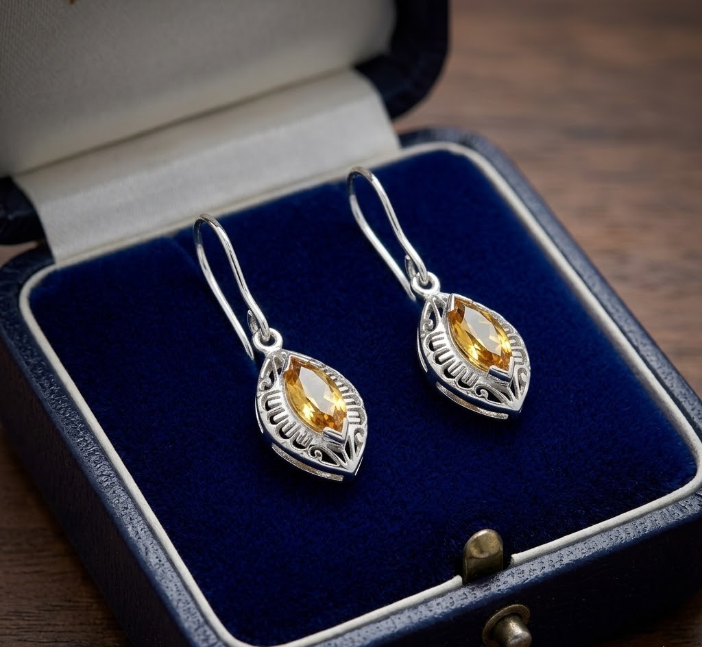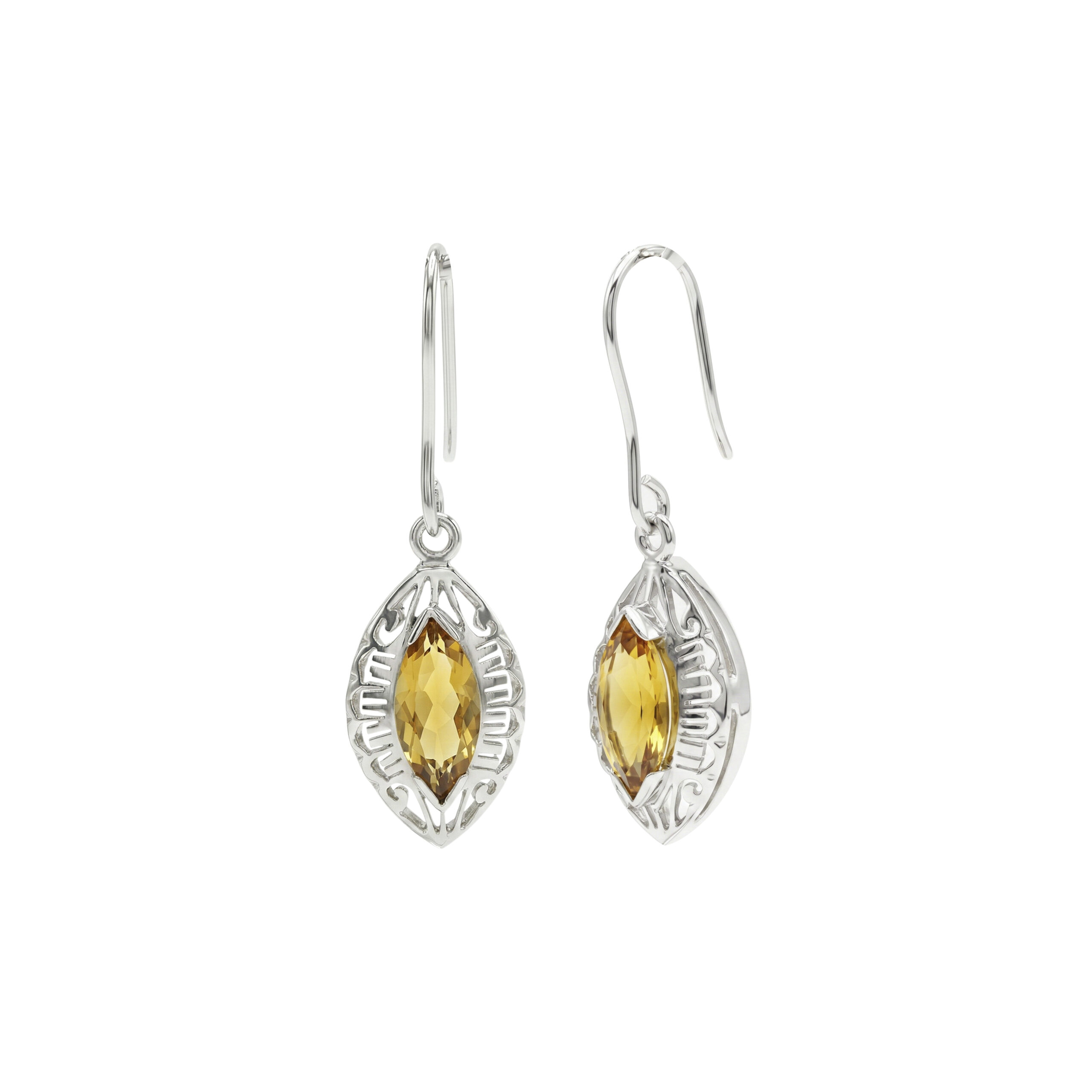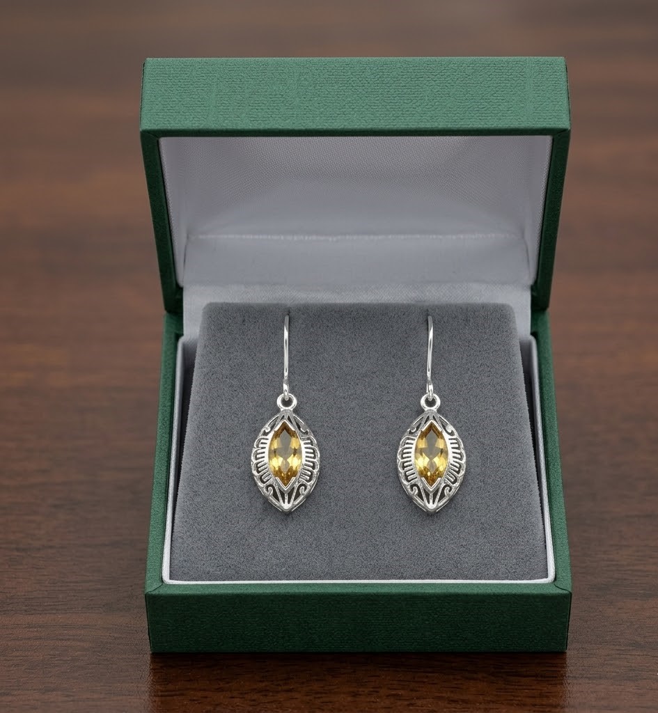 Handcrafted in 925 sterling silver, these earrings feature exquisite marquise-cut golden topaz where the natural stone is cradled within an intricate, ornate sterling silver filigree cage.