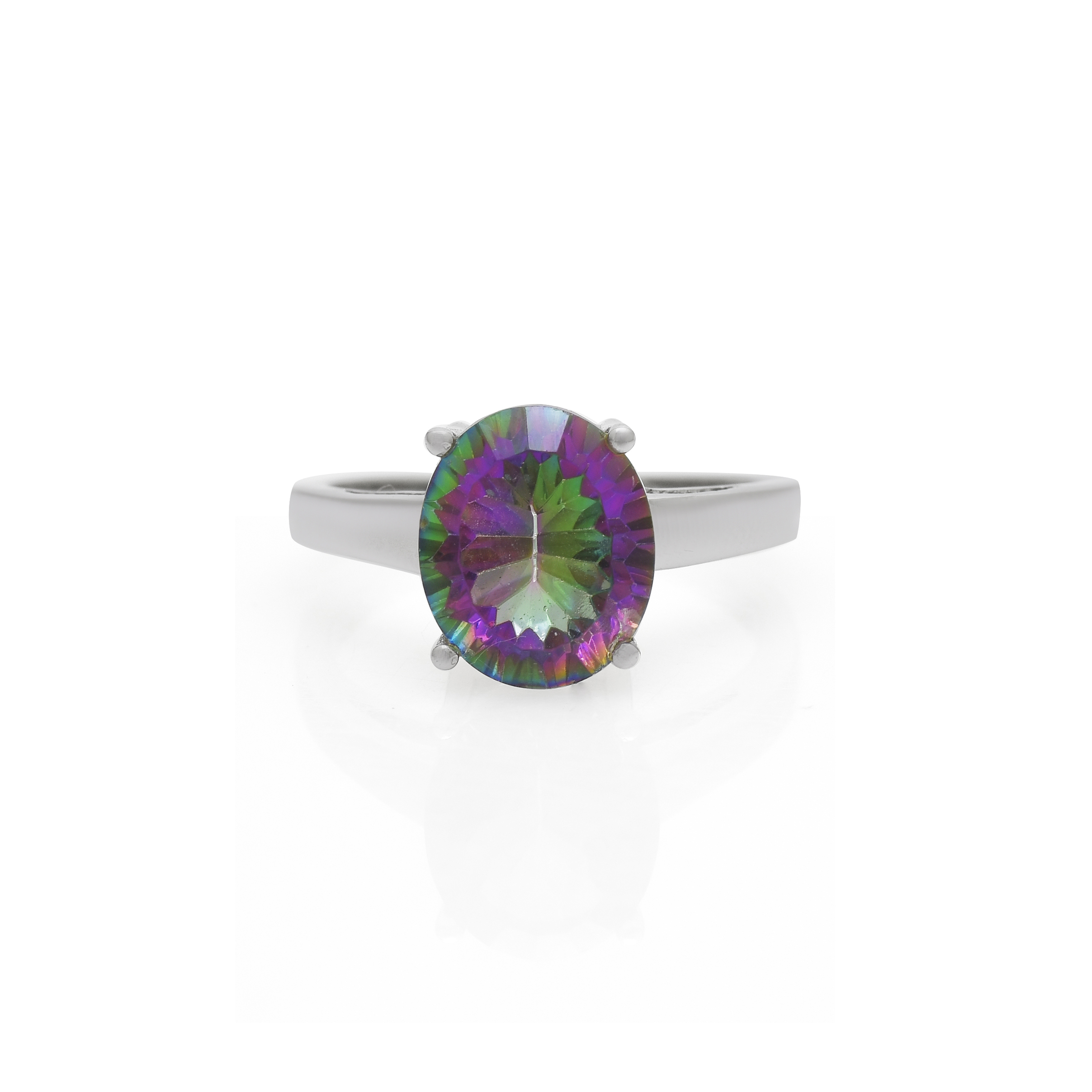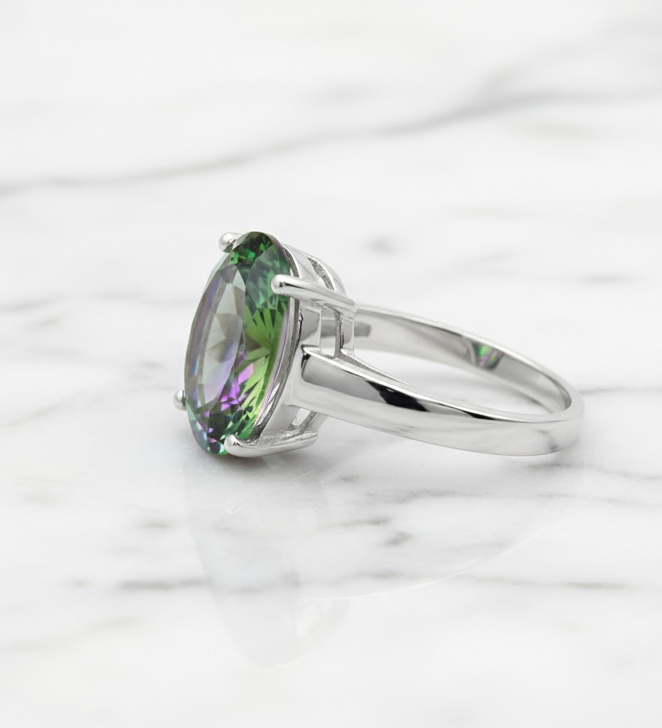 This mesmerizing ring is handcrafted in high-polished 925 Sterling Silver, featuring a stunning oval-cut Mystic Topaz which is known for its incredible “fire” and rainbow-like color shifts.