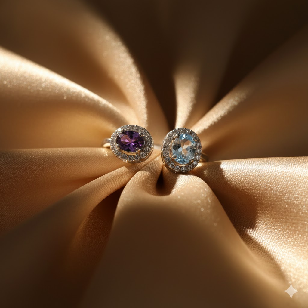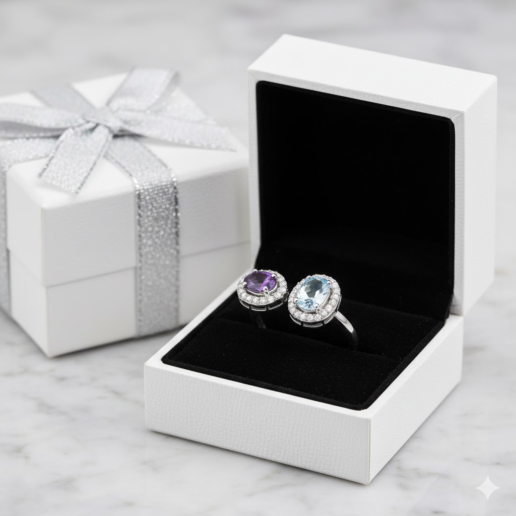 This striking 925 sterling silver ring features a vibrant duo of oval-cut blue topaz and amethyst, symbolizing a harmonious blend of serenity and luxury. Accented by a shimmering pave of cubic zirconia, the intertwining design creates a sophisticated statement piece perfect for adding a pop of color to any ensemble.