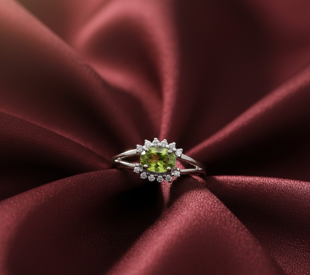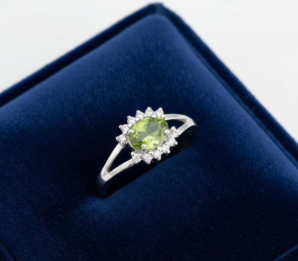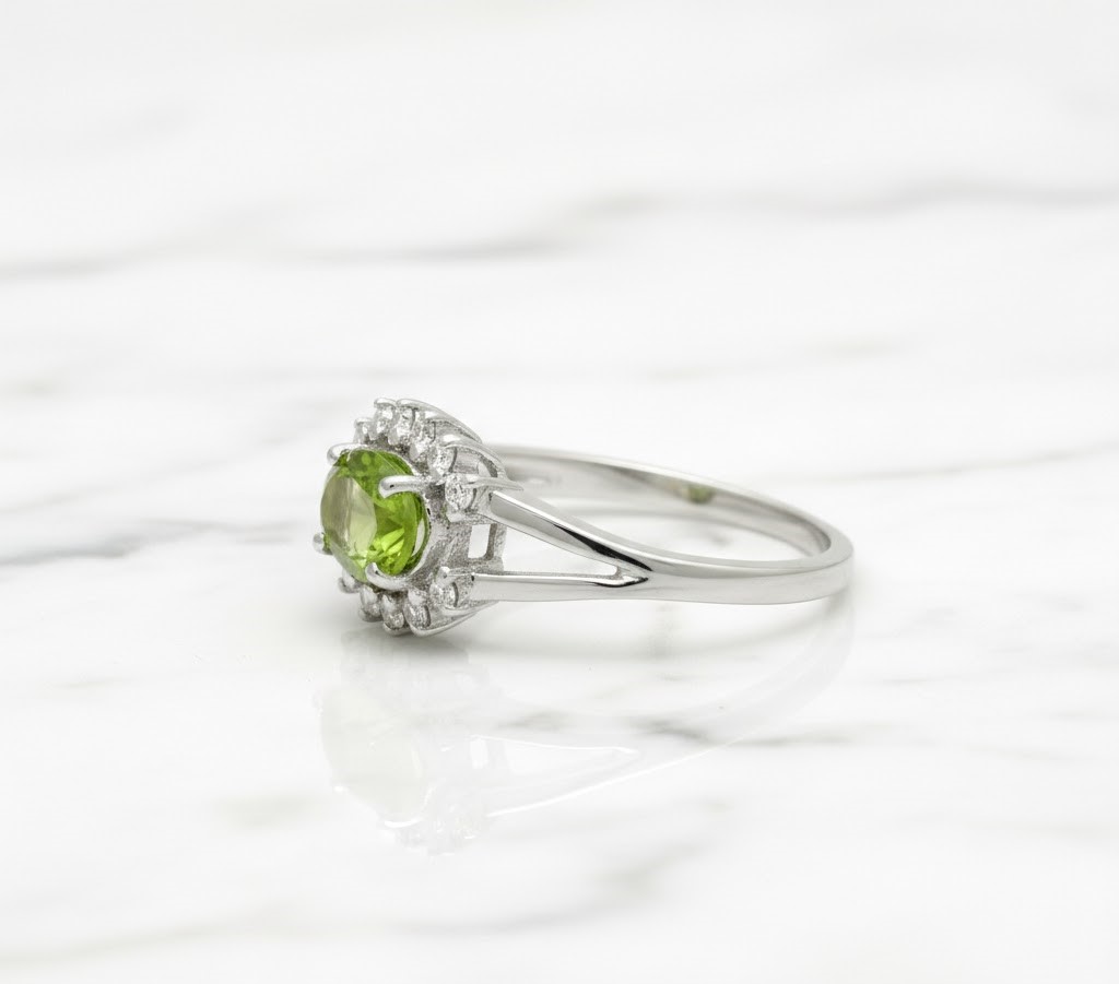 Expertly handcrafted in high-polished 925 Sterling Silver, this striking ring features a vivid, oval-cut natural Peridot at its center. The peridot’s lush lime-green glow is beautifully enhanced by a shimmering halo of natural White Zircons.