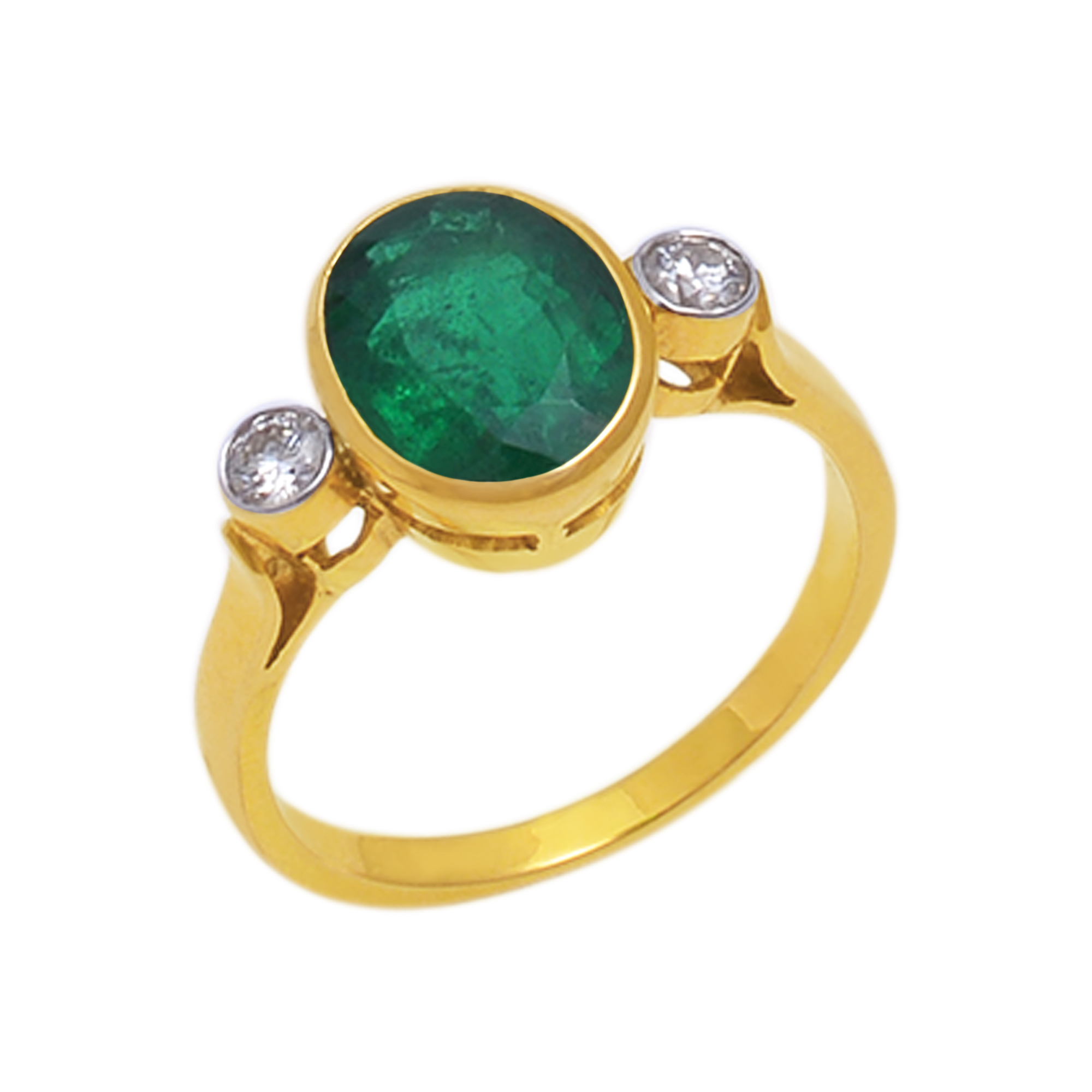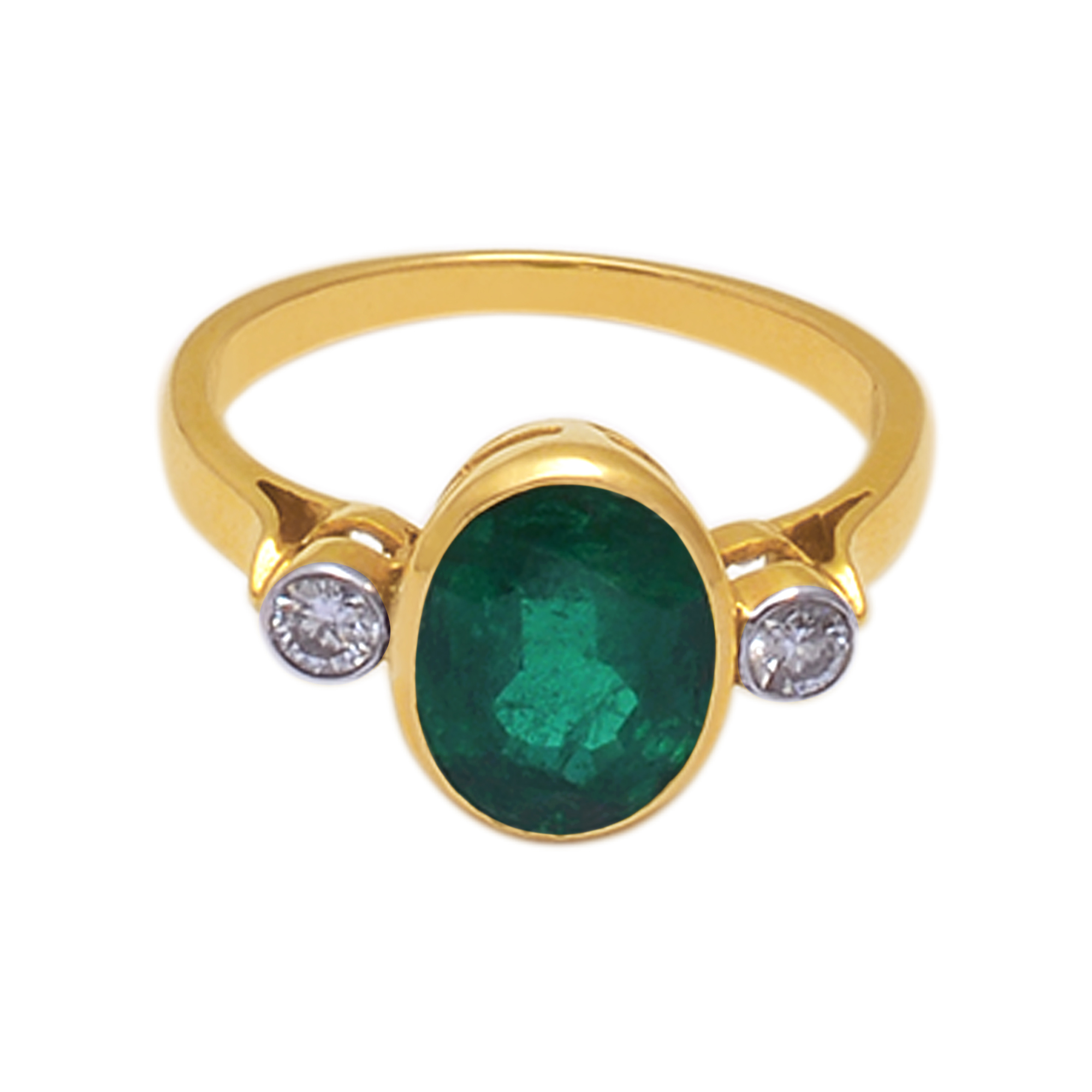 An enchanting oval emerald glows at the center of this 18KT yellow gold ring, embraced by a sparkling halo of diamonds. The rich green gemstone and radiant gold create a harmony of luxury and grace. A timeless piece that celebrates nature’s beauty with refined elegance