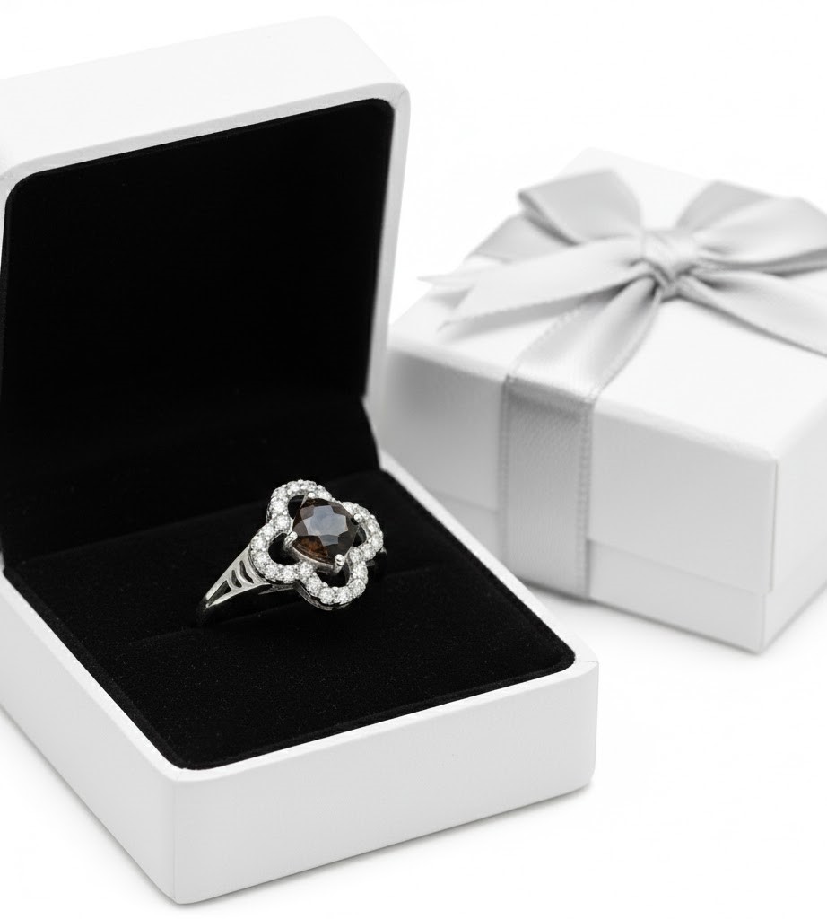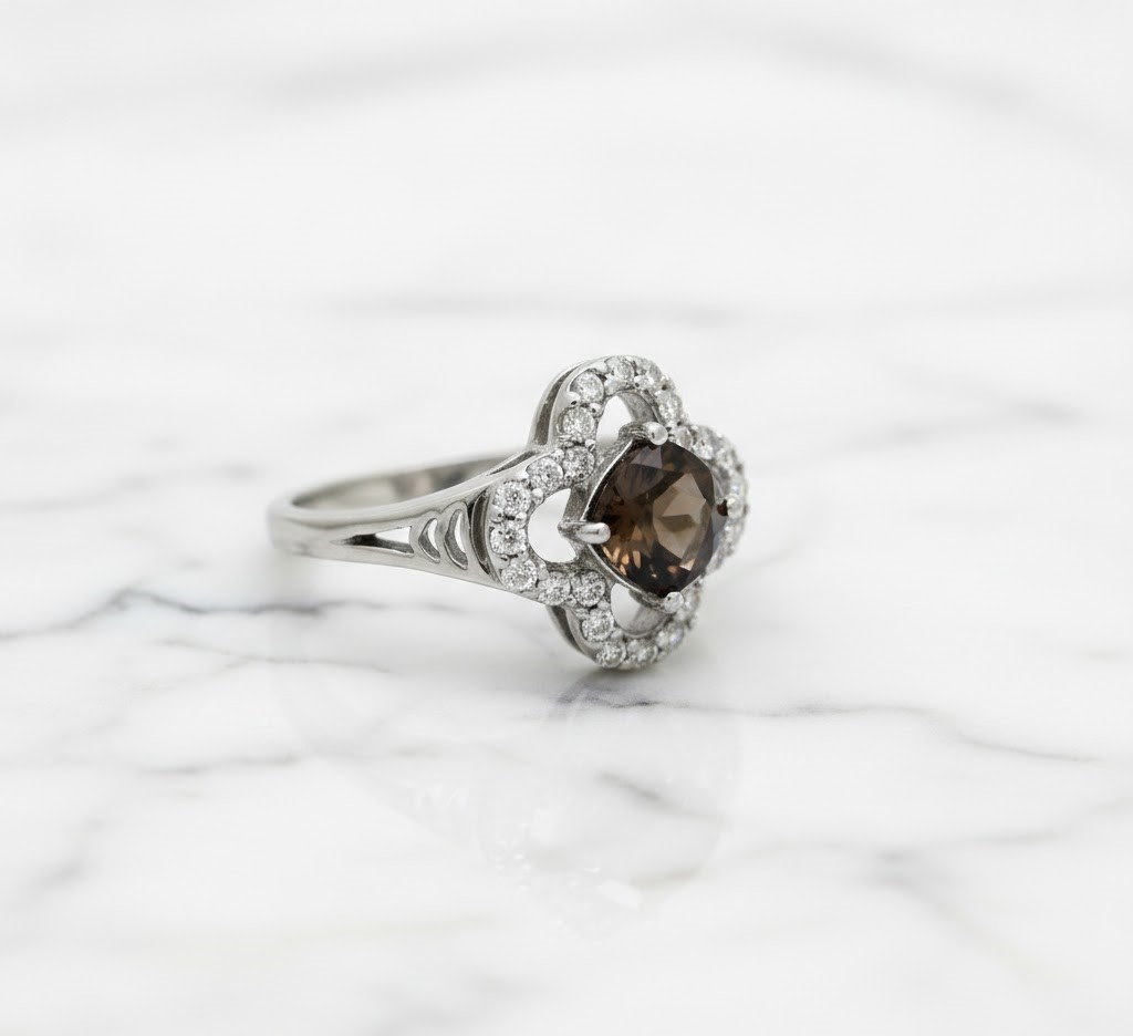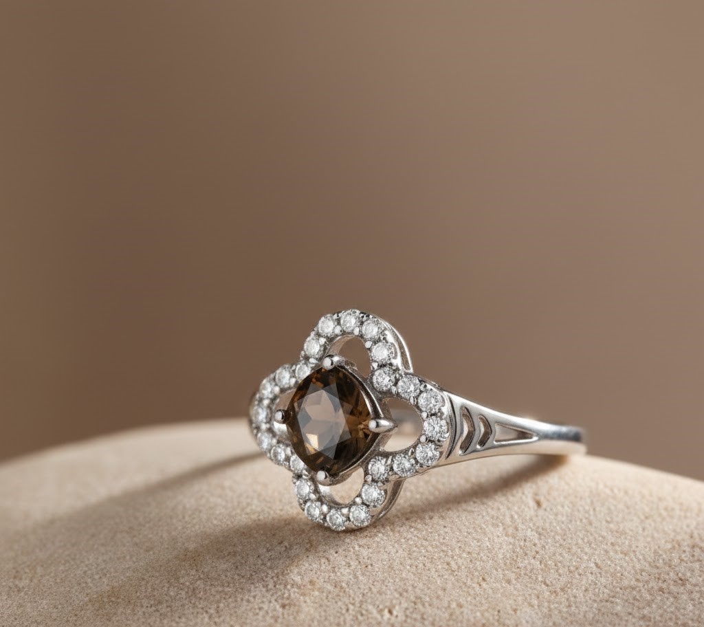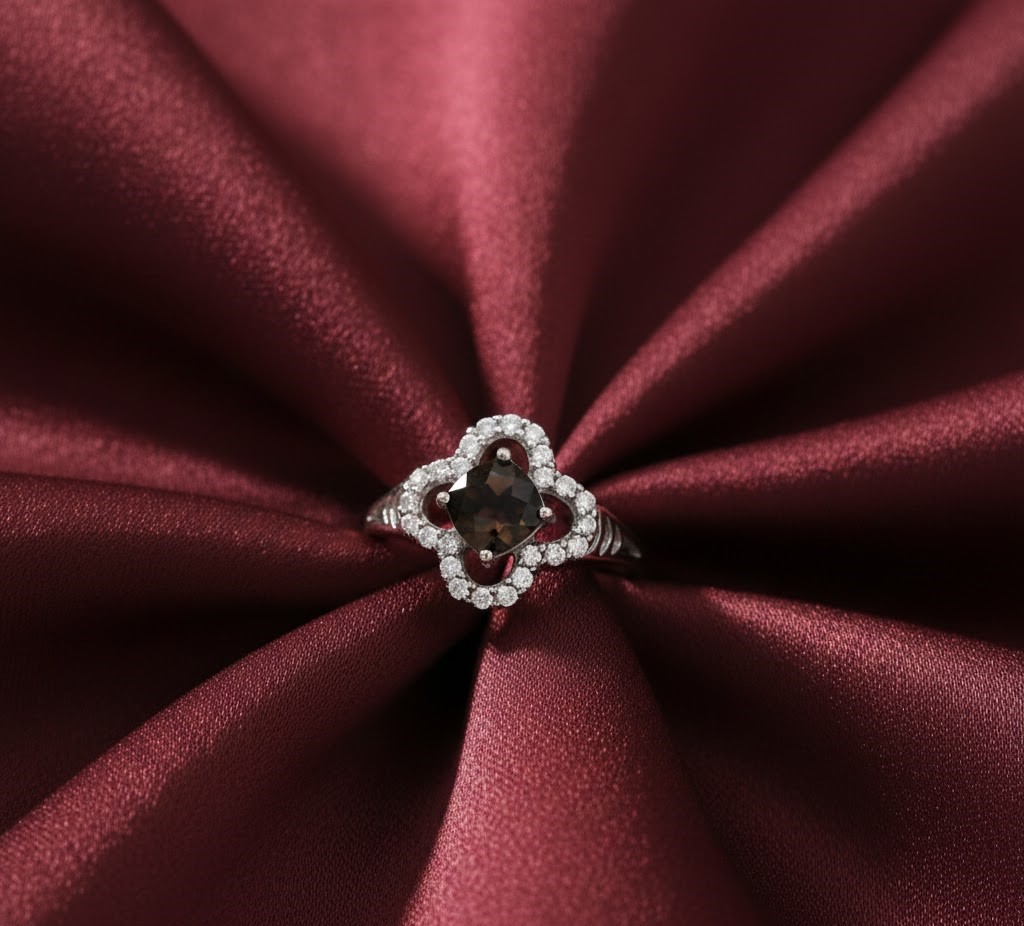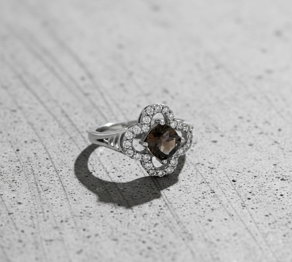 Expertly crafted in high-quality sterling silver, this ring features a stunning centerpiece: a faceted oval smoky topaz. The center stone is surrounded by a delicate, floral-inspired halo of natural white zircons.