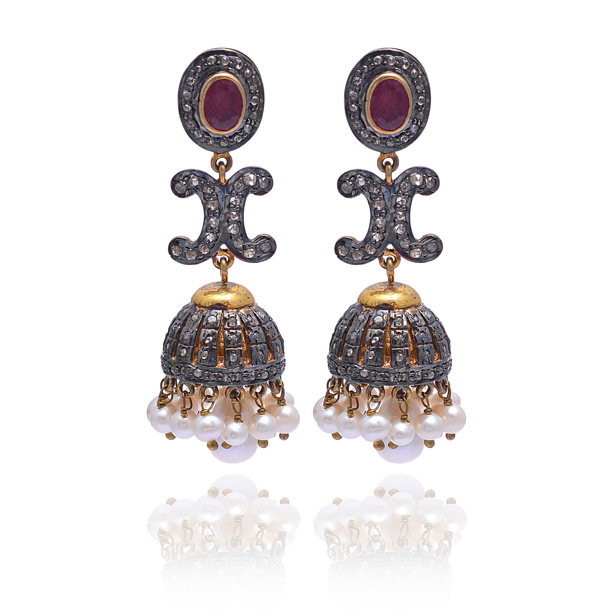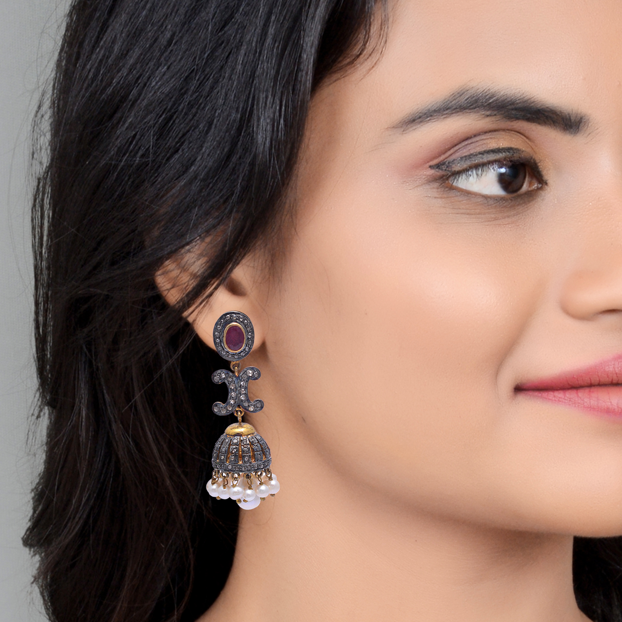 Step into timeless elegance with these Victorian-inspired earrings, featuring vibrant rubies, raw uncut diamonds, and lustrous pearls. Set in gold-plated sterling silver, the design beautifully blends rich color with natural textures and classic sophistication. Perfect for those who cherish vintage charm and handcrafted artistry, these earrings make a graceful statement—combining the romance of the past with the allure of luxurious, one-of-a-kind jewelry pieces.