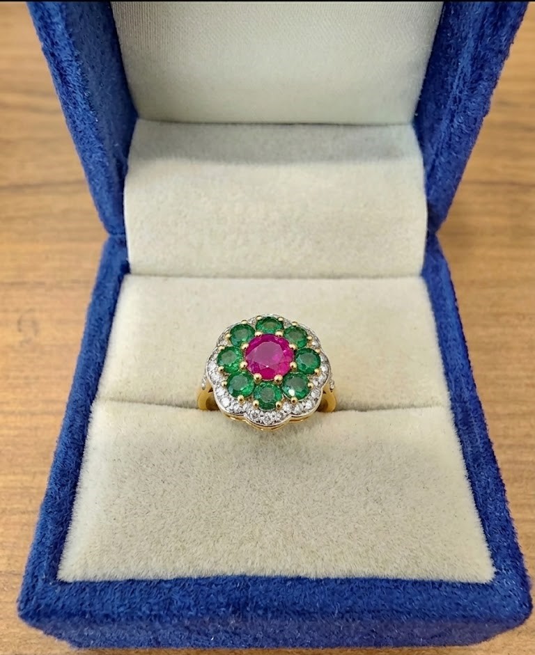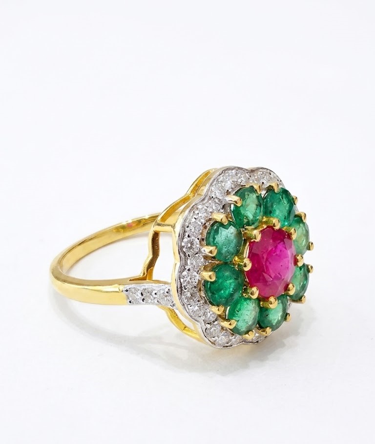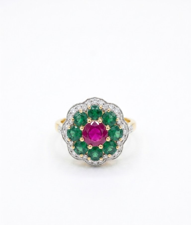 Embrace the beauty of nature with this exquisite Ruby, Emerald, and Diamond Flower Ring, artisan-crafted in luxurious 14KT Gold. This captivating piece features a vibrant floral design, where shimmering rubies and rich emeralds are meticulously arranged to create blooming petals, accented by delicate diamonds that add a brilliant touch of sparkle.