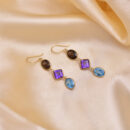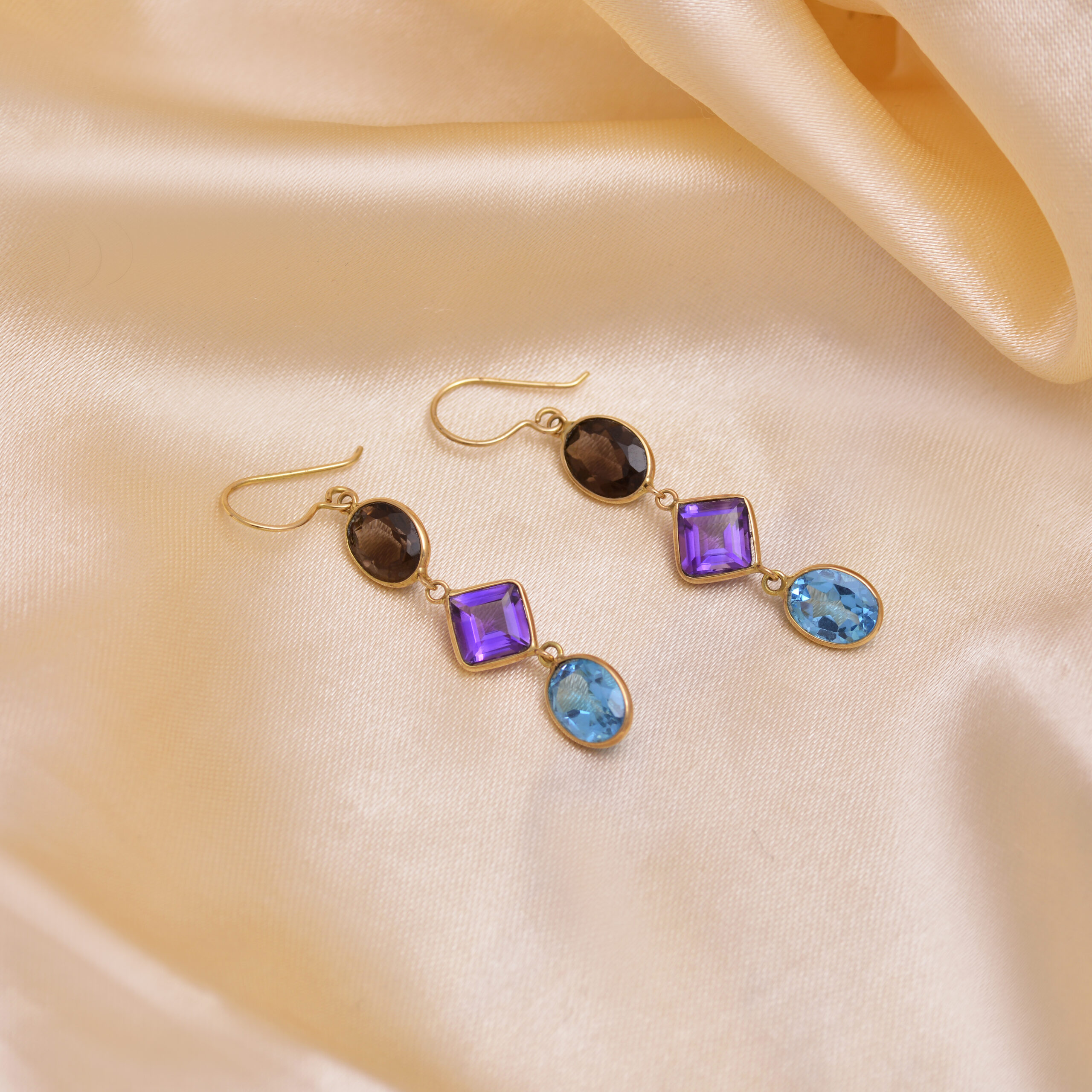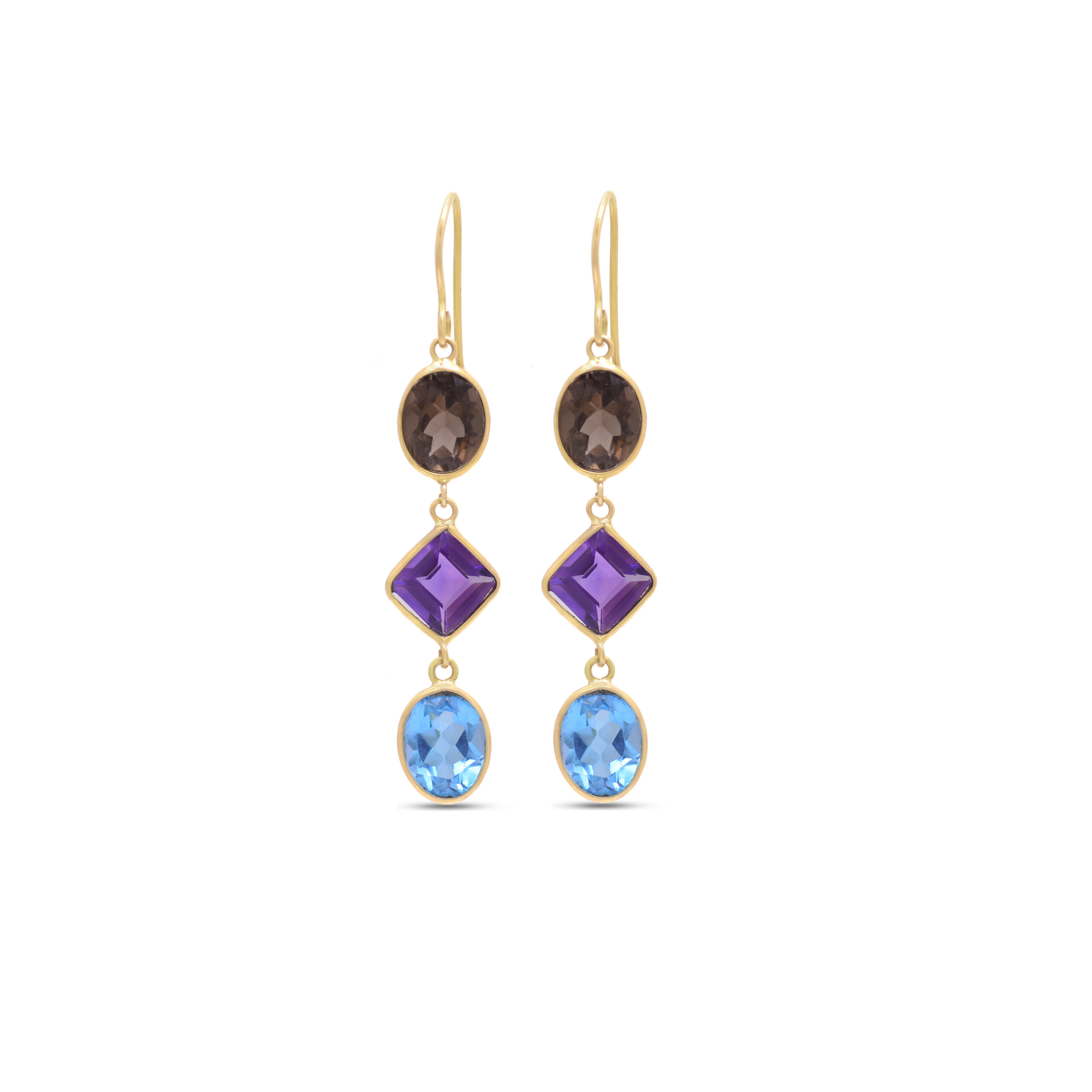 Embrace rich, colourful elegance with these stunning earrings featuring smoky topaz, amethyst, and blue topaz gemstones, all set in radiant 18KT gold. The harmonious blend of warm and cool tones creates a unique, eye-catching design — perfect for adding a touch of sophistication and charm to any outfit.