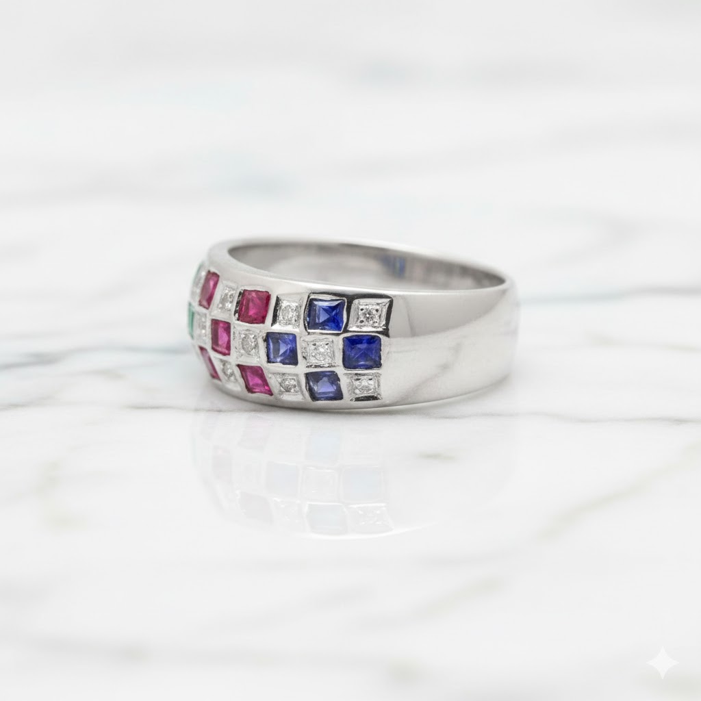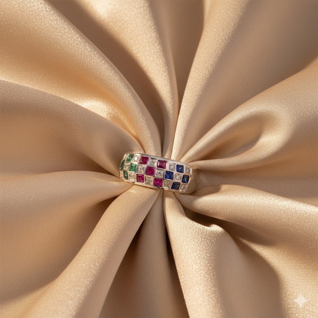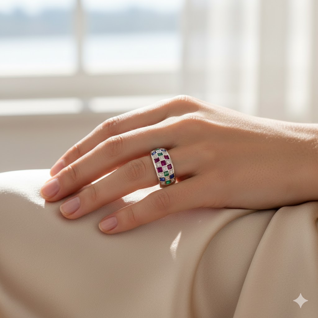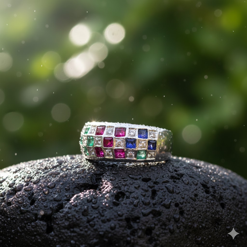 A vibrant mosaic of gemstones glows against smooth silver like scattered light. Playful, elegant, and full of color — a ring that celebrates individuality.
