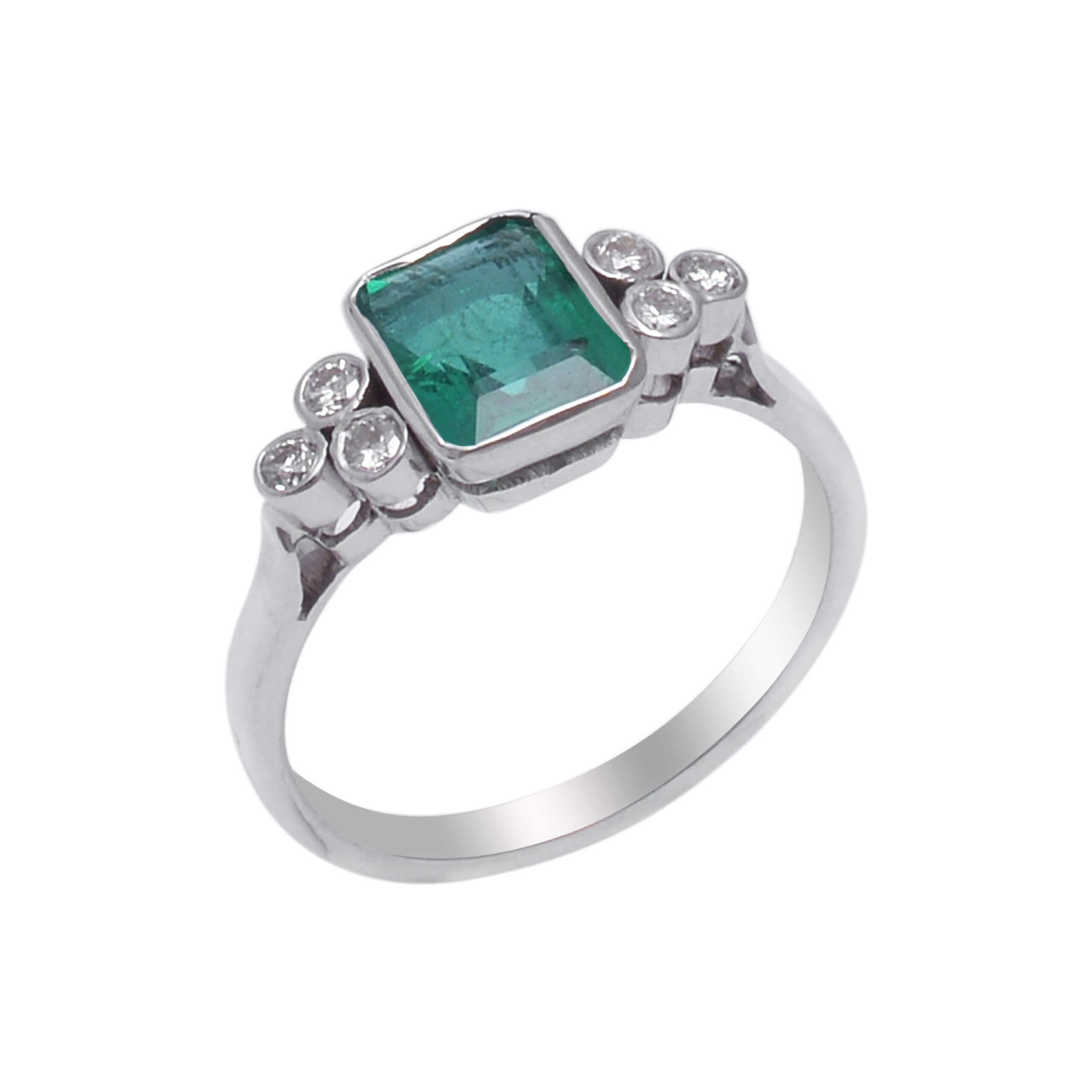 A captivating square-cut emerald shines at the center of this 18KT white gold ring, beautifully accented with sparkling diamonds. The vivid green gem contrasts elegantly with the brilliance of white gold. A timeless creation that embodies sophistication and enduring beauty