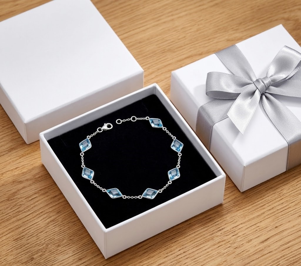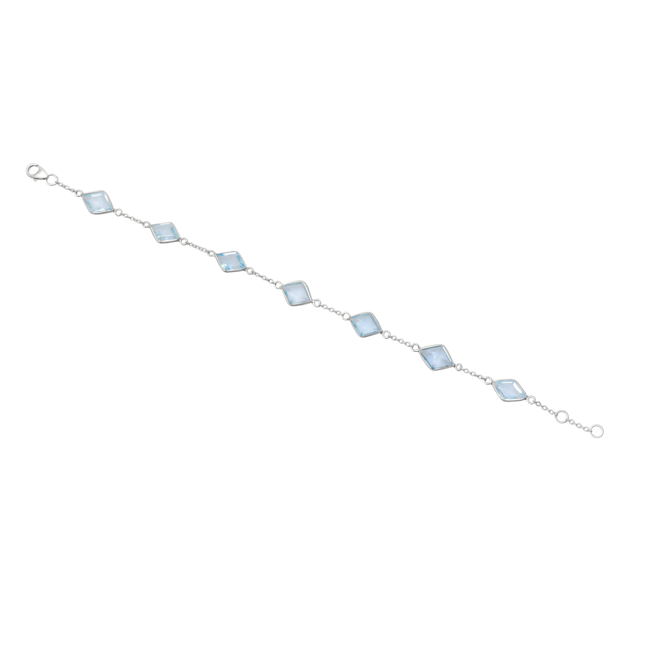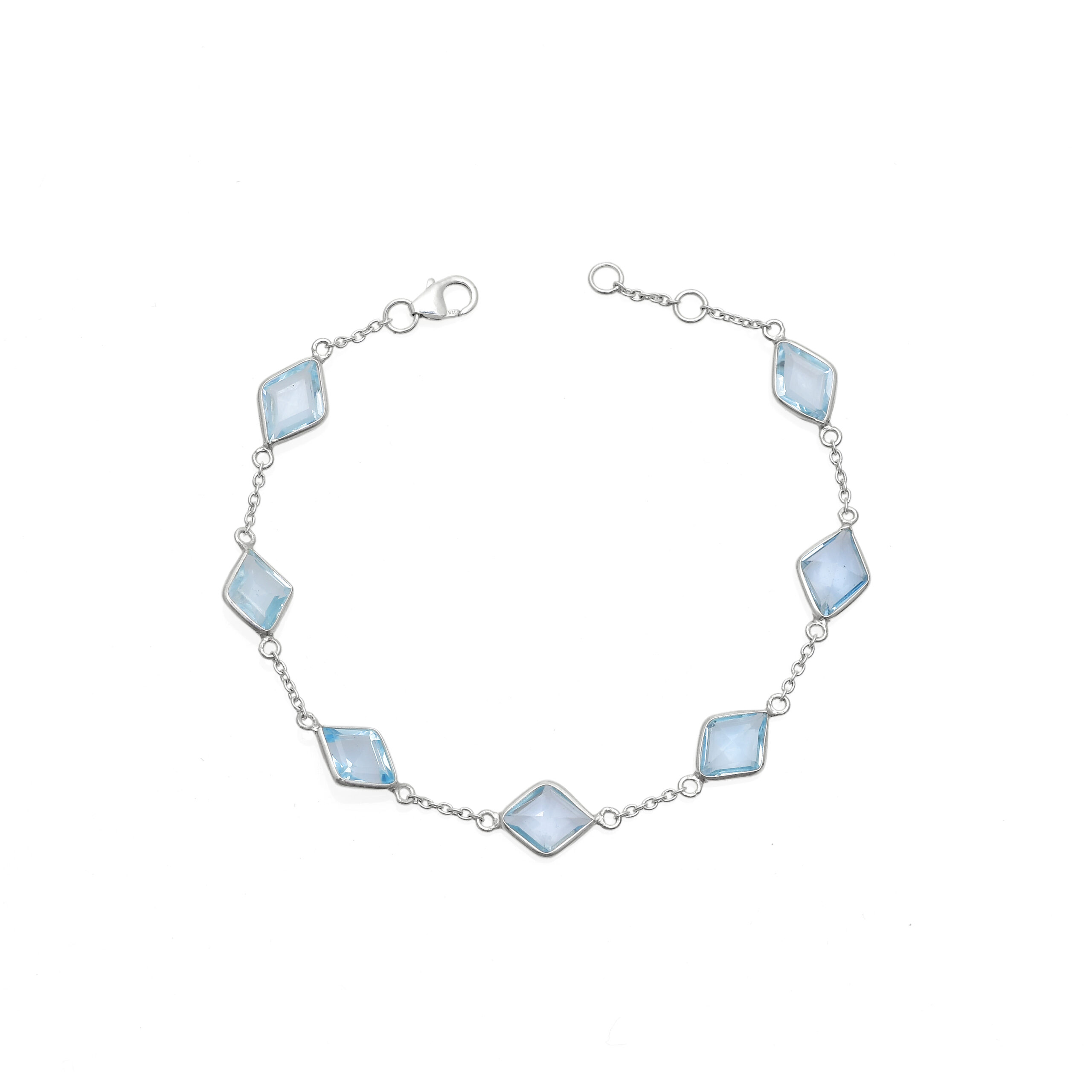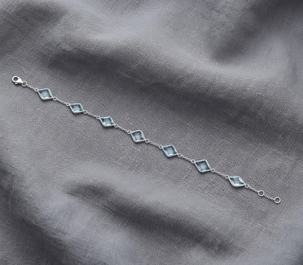 Crafted with high-quality 925 Sterling Silver, this piece features seven beautifully faceted light blue topaz gemstones. The unique rhombus (diamond) cut of the stones offers a modern, geometric twist.