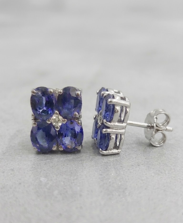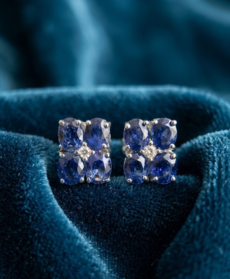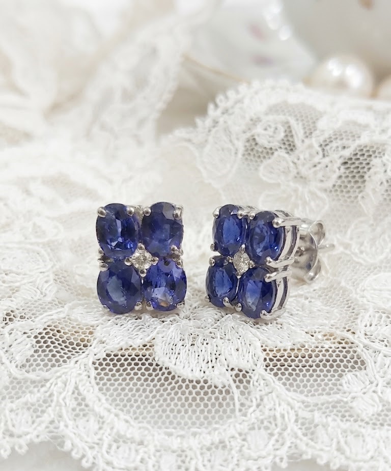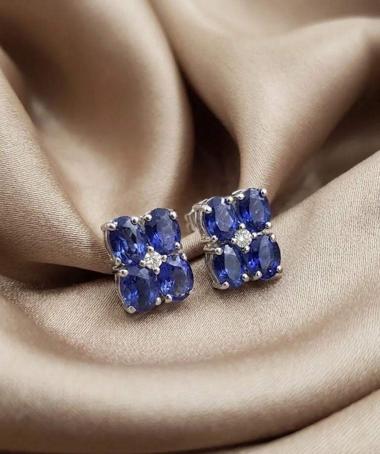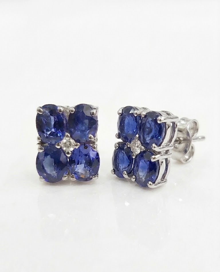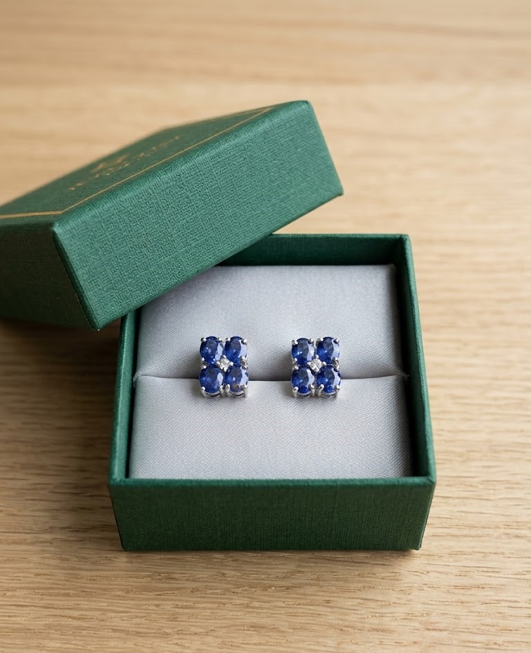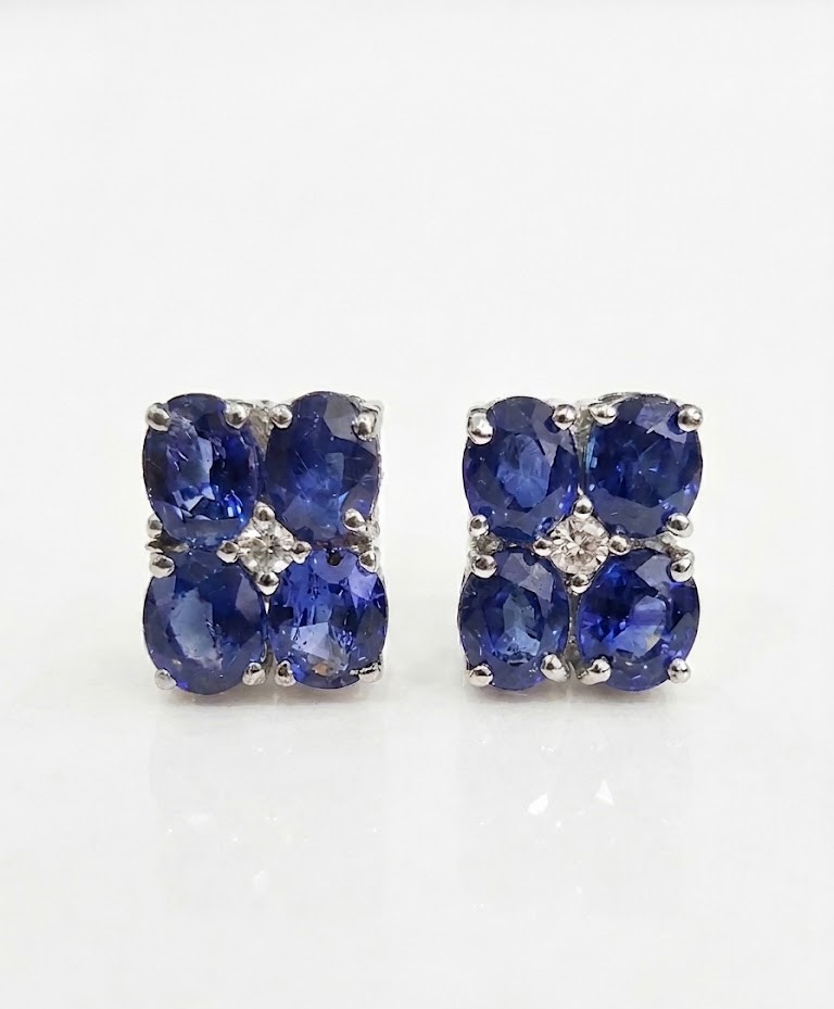 Handcrafted in high-quality sterling silver, each earring features a sophisticated arrangement of four oval-cut deep blue sapphires, centered with a shimmering diamond-style accent.