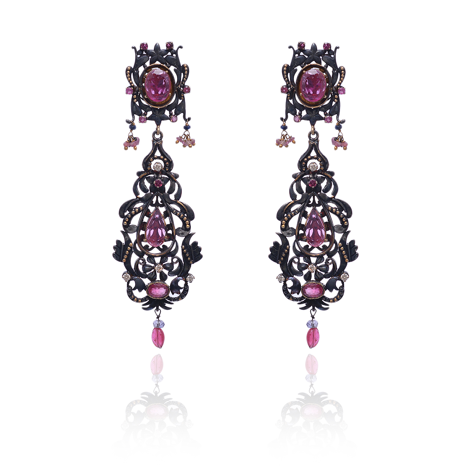 Capture vintage elegance with these Victorian-inspired earrings, featuring radiant tourmaline gemstones paired with raw, uncut diamonds. Set in sterling silver, the design beautifully contrasts the polished metal with the natural, earthy textures of the stones. Perfect for those who appreciate antique charm and unique craftsmanship, these earrings offer a timeless blend of vibrant color and organic sparkle—ideal for adding a touch of refined individuality to any look.